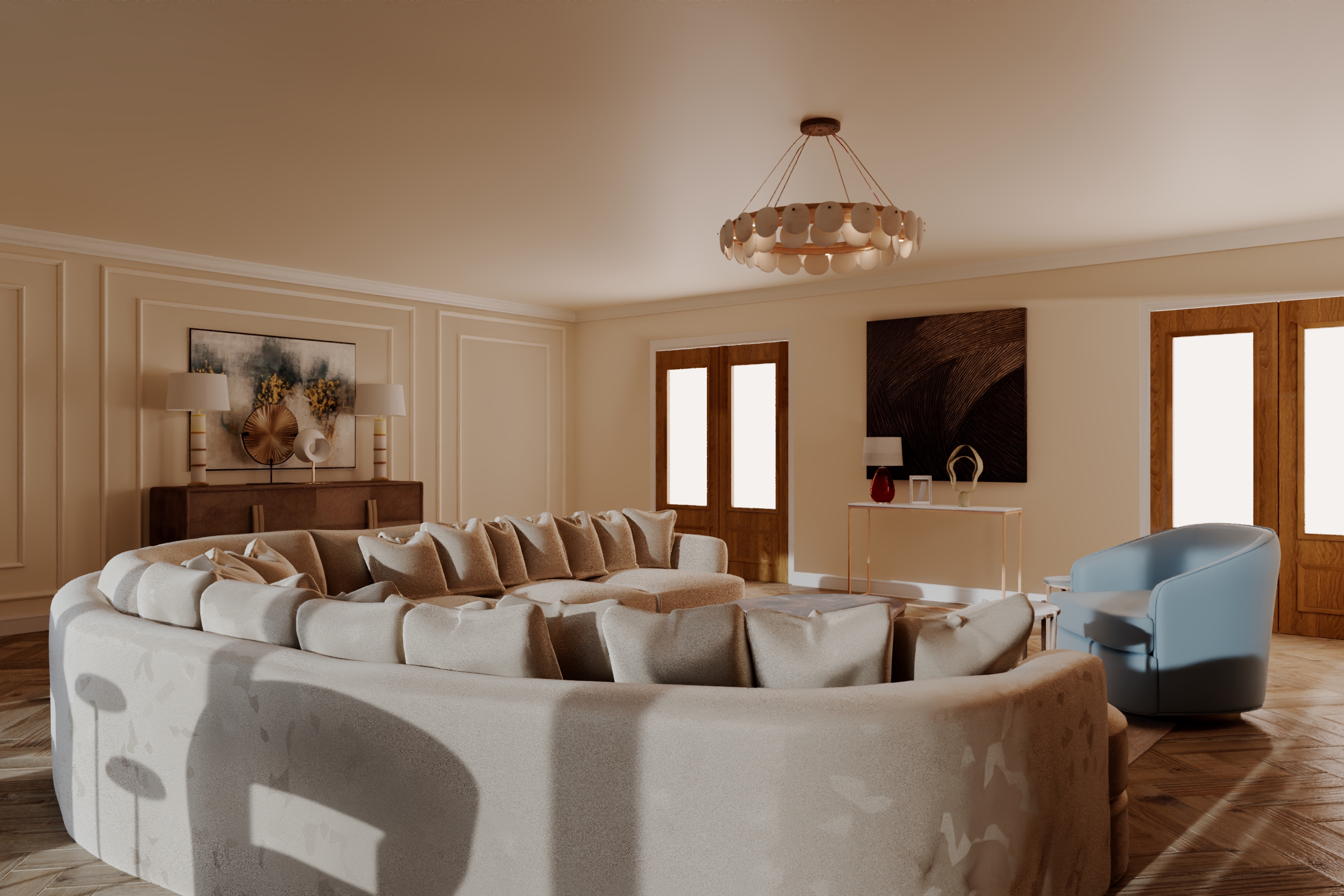 can you make sure the glazed internal doors have frosted glass not glowly glass make sure the wood stays as is but slightly lighter improve the lighting make the sofa seamless beige velvet