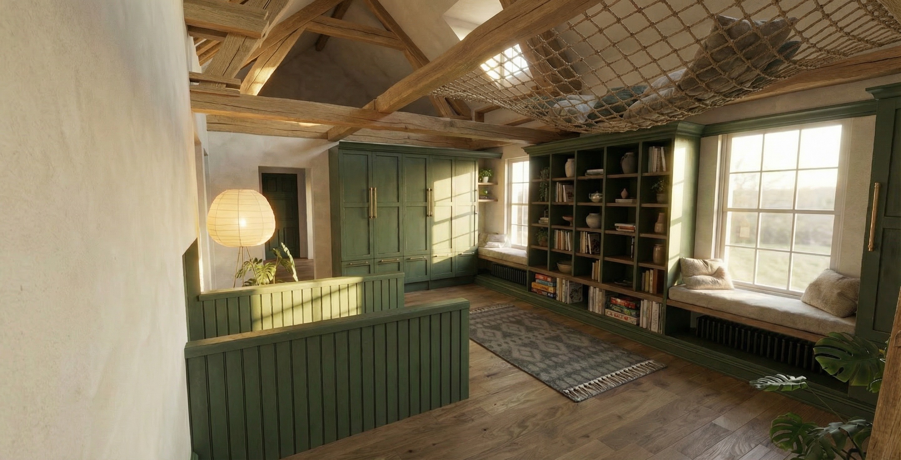 put the rope net above the other window add light on the mezzanine with pouf and toys