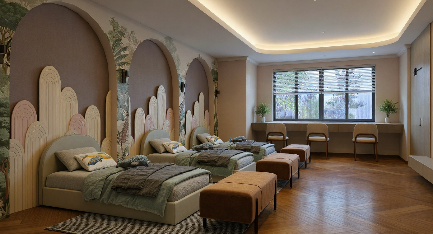 photorealistic image minimalistic scandinavian style bathroom walls and floor from bright beige microcement cabinet from natural bright oak veneer washabasin and fron walls from beige marble light coming from the back
