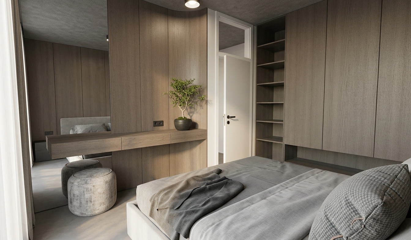 use the first render as the base image and preserve the overall atmosphere lighting camera perspective and all materials in the room completely remove the existing curved upper cabinets above the bed from the original render replace them entirely with the cabinetry design from the model screenshot use the exact cabinet layout proportions and panel lines from the screenshot across the full wall above the bed also replace the wall niche behind the bed with the new niche design from the screenshot and finish it in natural oak wood veneer matching the nightstands important the previous rounded cabinets must be fully removed and replaced by the new cabinetry design everything else must stay exactly the same as in the original render the dark grey upholstered bed cinnamon pillows dark green blanket oak floor wardrobes lighting window curtains rug nightstands sockets and wall lamps only change the upper cabinets and the niche behind the bed do not modify any other furniture materials lighting or camera position