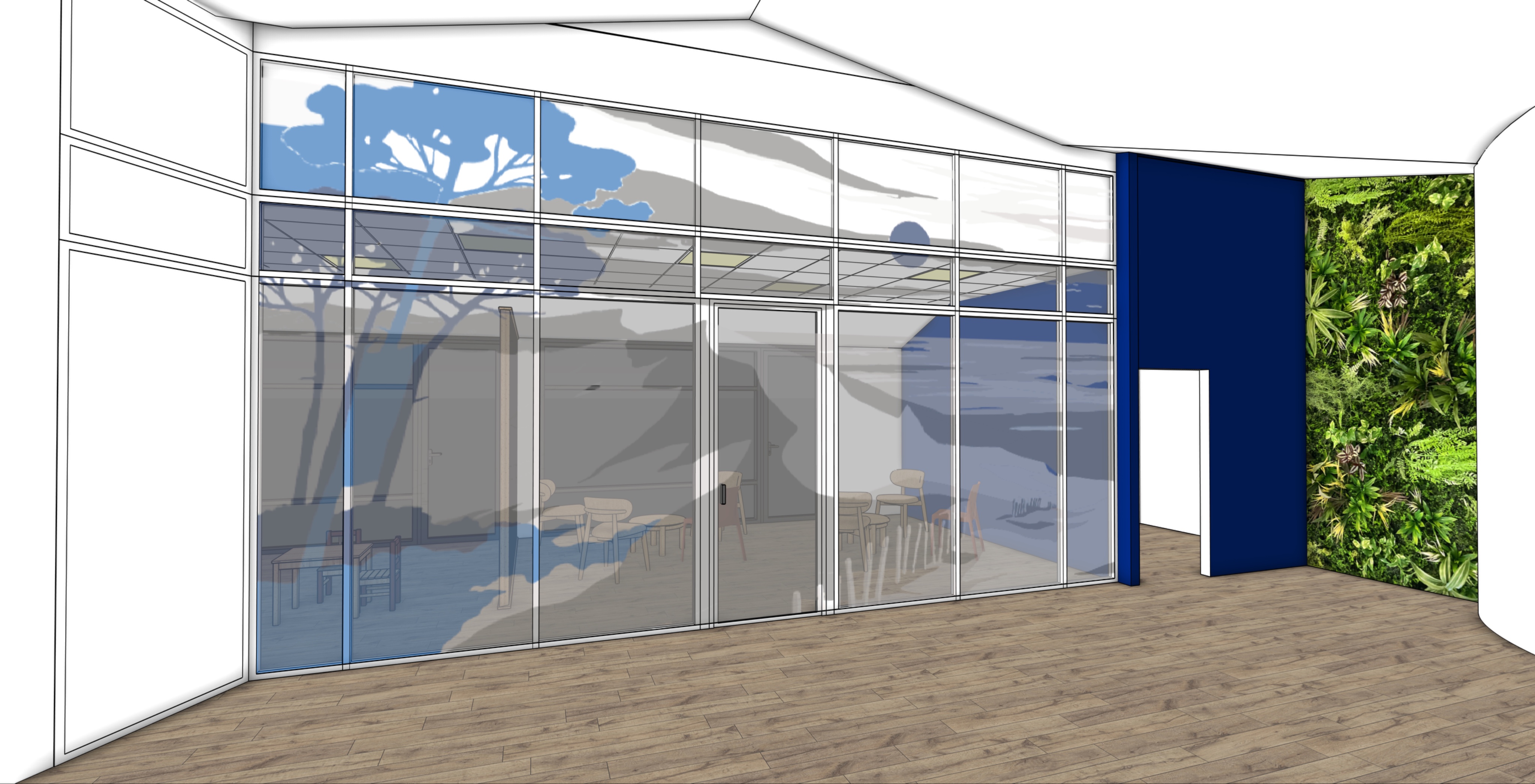 create a photorealistic rendering of this room composed of modular glass partitions and a landscape themed window film natural light comes from the bay windows at the back of the room