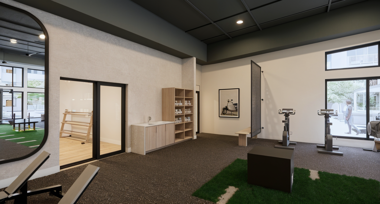 artistic grainy watercolor rendering of house with black and medium tone warm wood siding surrounded by oak tree forest and leafy forrest floor some branches in the foreground dense forest background asphalt driveway where indicated architecture