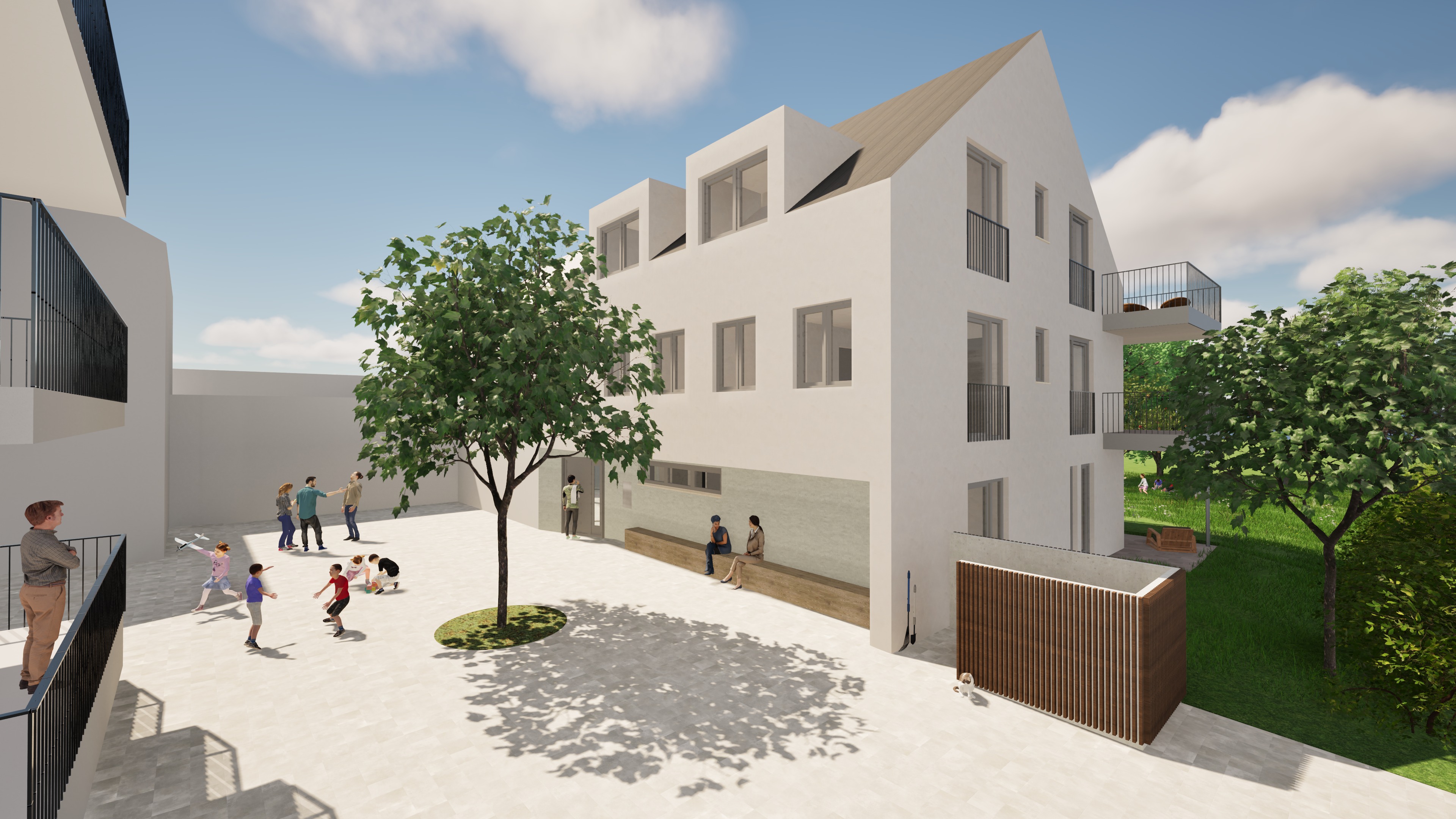enhance the existing architectural rendering while strictly maintaining the original camera position perspective framing and composition do not alter the geometry proportions or design of the building create a calm high end photorealistic visualization that conveys a refined and professional atmosphere the image should feel natural balanced and realistic as if captured with professional architectural photography use soft natural daylight with realistic global illumination subtle shadows and accurate material reflections improve material quality with highly detailed physically accurate textures concrete glass metal wood etc ensuring correct roughness reflections and depth glass should have realistic transparency and subtle reflections surfaces should show slight natural imperfections to avoid a cgi look refine lighting and color grading to achieve a harmonious warm and inviting mood without becoming dramatic or over stylized avoid exaggerated contrast or artificial effects the atmosphere should feel calm and sophisticated enhance environmental details landscape sky vegetation people if present to support realism while keeping the focus on the architecture add subtle depth of field only if appropriate maintaining sharpness on the building the final result should look like a premium real estate marketing visualization elegant realistic and professionally presented