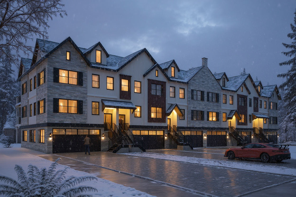 render this image photorealistic keeping all the elements create an ambiance with people light coming form inside the building dramatic view