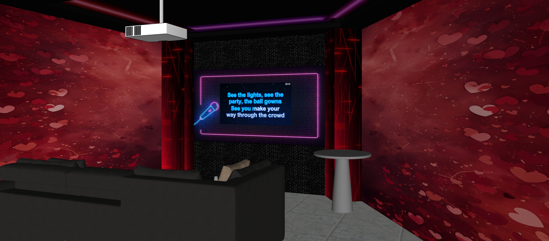render an interior ktv room maintain the photo with black painted ceiling with led cove light romantic ambiance