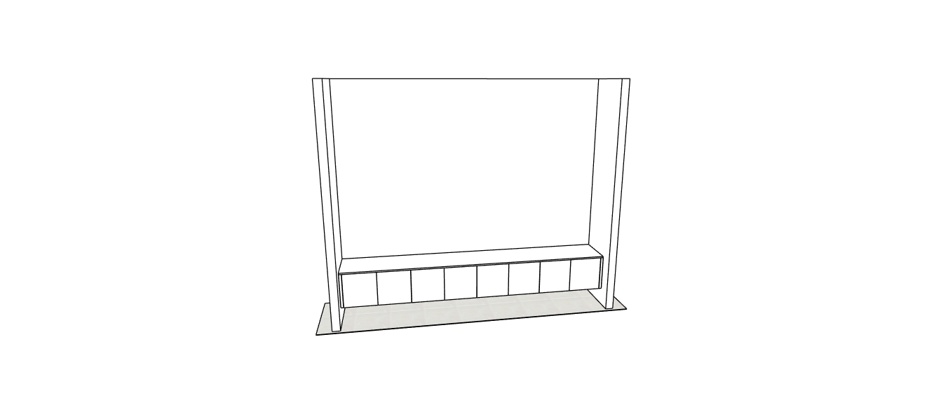 white shaker style doors and half moon handles at the top of the doors tv wall mounted in the centre of the wall evening sunlight shining in