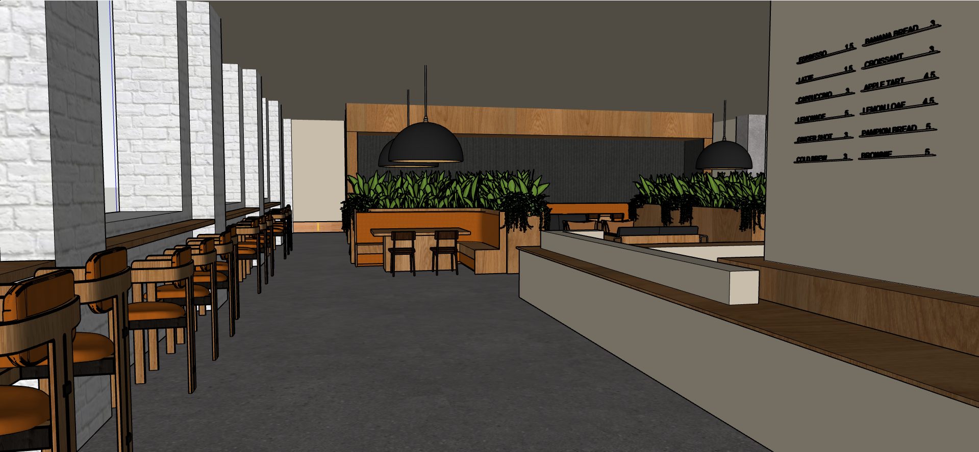 transform this into a refined photorealistic caf interior rendering with a warm modern hospitality focused atmosphere keep the long linear perspective looking down the dining space emphasize the tall windows along the left side the row of dining chairs the layered planter dividers the wood framed banquette structure at the back the dark pendant lights and the clean service counter in the foreground on the right materials should read as flooring dark charcoal concrete or large format matte surface with subtle variation left wall and columns painted white brick with realistic texture window frames dark metal seating and millwork warm natural white oak or light walnut with rich grain and matte finish chair cushions warm cognac leather or leather like upholstery banquette upholstery soft charcoal or muted gray fabric counter and low walls smooth warm light taupe plaster or painted gypsum with crisp edges back feature wall dark ribbed or fluted surface with subtle texture planters warm wood to match millwork with lush realistic greenery pendant lights matte black metal lighting should be soft natural daylight entering from the tall windows on the left balanced with warm ambient interior lighting create realistic shadows soft contrast natural reflections and a bright but grounded mood the overall feeling should be calm elevated warm contemporary and believable like a thoughtfully designed boutique caf or hospitality lounge keep the image clean and minimally styled add only subtle realism through believable material texture soft daylight glow and light interior ambiance maintain a polished architectural visualization quality do not add extra furniture do not change the menu wall do not alter the planters do not move pendant lights do not warp the chairs do not change the layout do not overcrowd the space do not introduce excessive d cor and do not create ai artifacts no dramatic styling no surreal effects no redesign