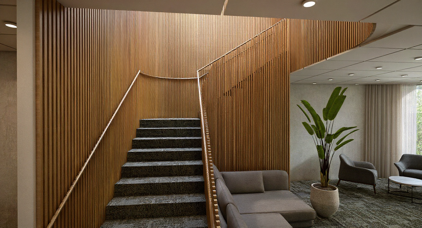 citrus trees outside window white oak cabinetry marble floors and backsplash above the vanity