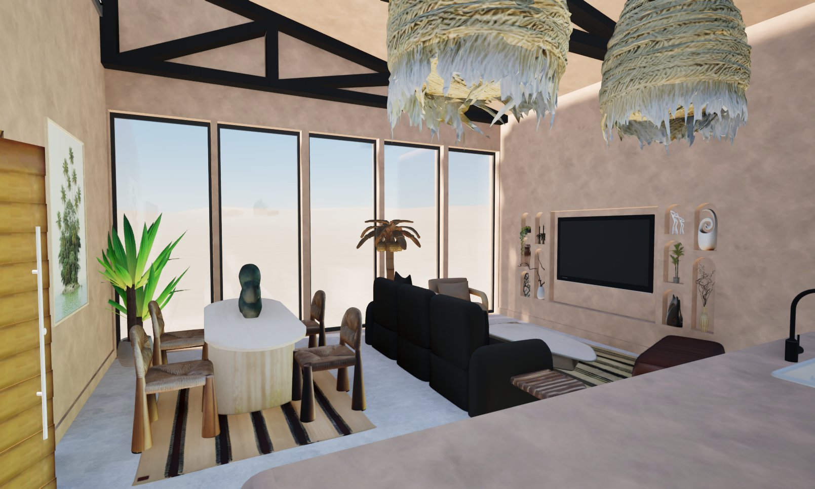 change the sofa colour to a rich dark moss green with soft fabric texture add warm sunlight streaming gently through the large windows creating natural highlights and soft shadows across the room outside the windows introduce a townhouse inspired backyard with subtle caribbean influences think light greenery textured stone and hints of tropical foliage but keep it refined and understated maintain the calm earthy interior palette and overall balanced lighting for a relaxed natural atmosphere