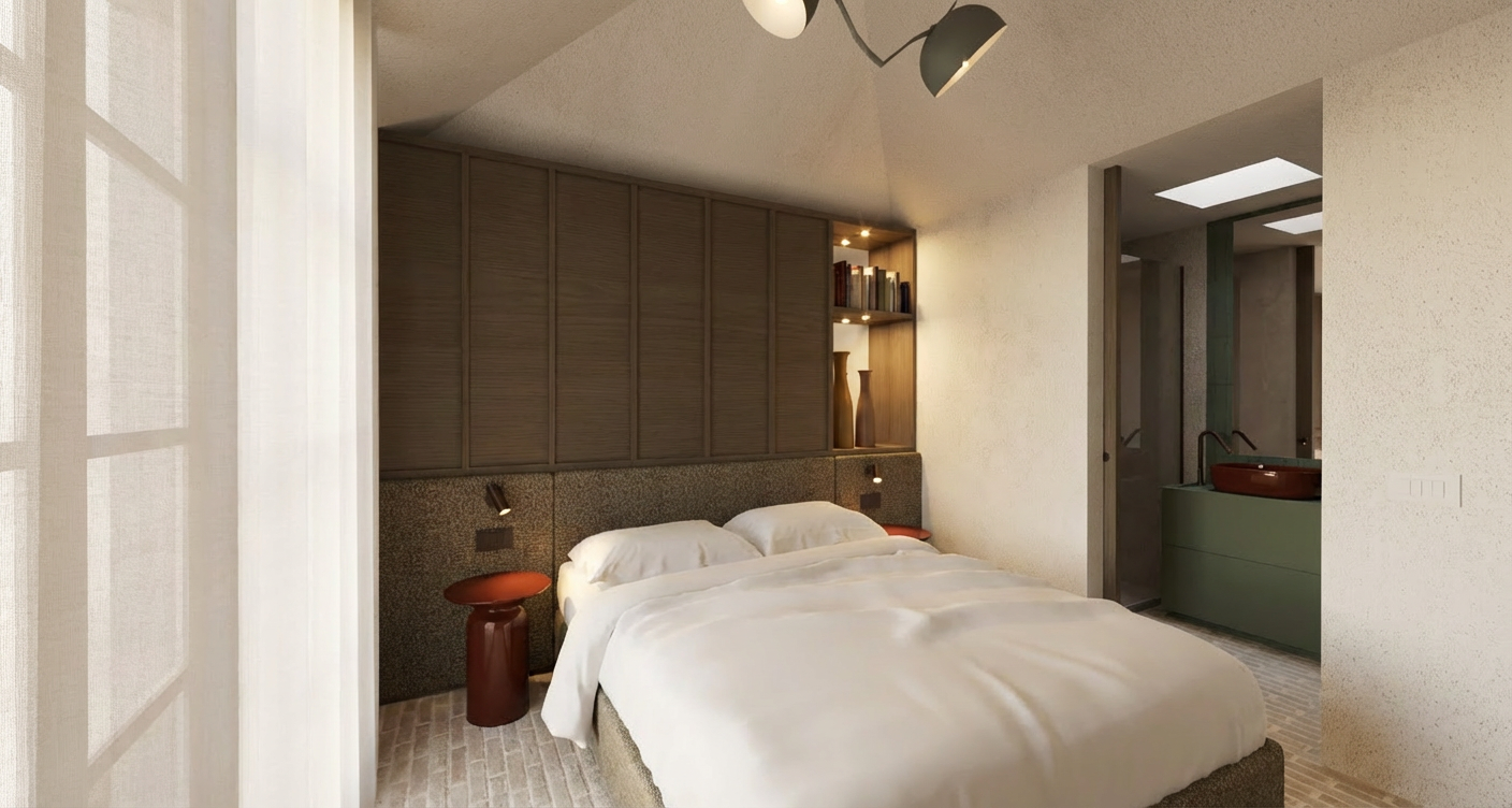 le pareti sono intonacate bianco caldo intonaco con texture come muri esterni mantieni tessuto testata letto specchio dietro nicchia libri e vasi comodini laccati lucidi rosso ruggine scuro luci lettura con finitura metallo marrone accendi micro faretti dentro nicchie ceramica lavabo rosso ruggine scura lucida legno rovere come texture immagine leggermente spazzolato mantieni specchio sono nella nicchia come fondale ai libri ed ai vasi mantieni texture immagine a pavimento mantieni mobile bagno laccato verde opaco fai entrare luce naturale anche da velux soffitto bagno