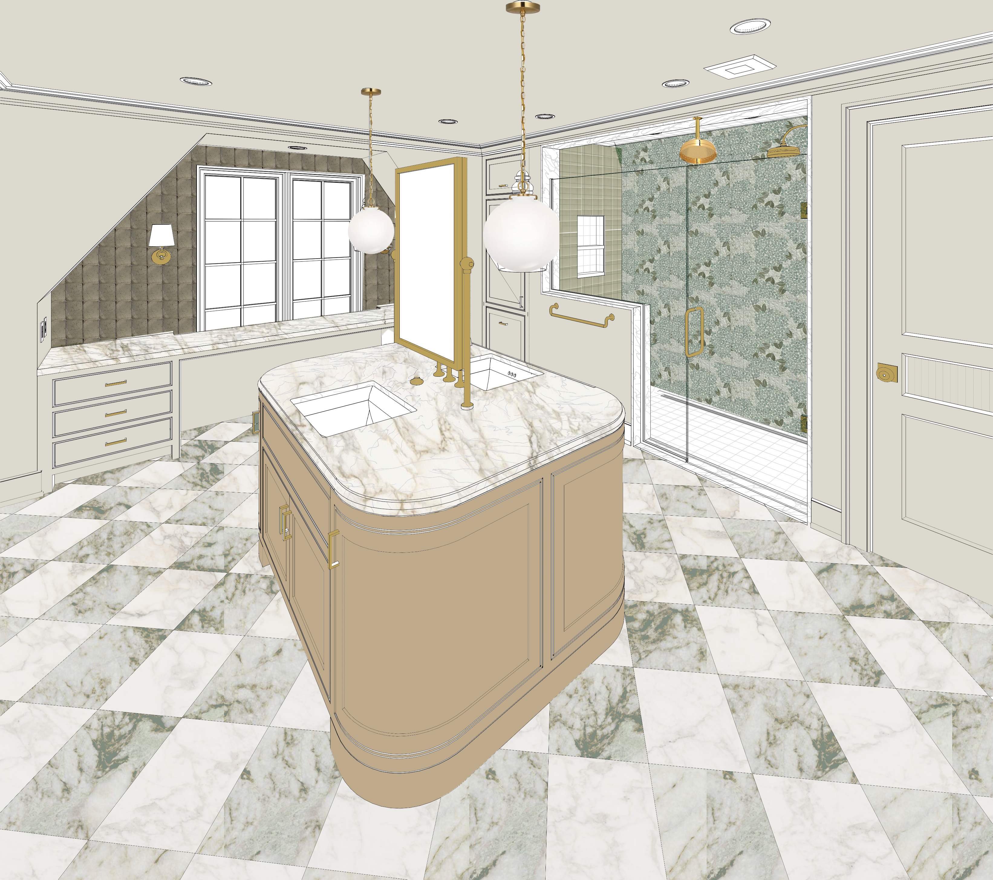 luxury transitional primary bathroom maintain the existing layout scale and architectural details exactly as shown do not alter window placement ceiling height or camera perspective apply a sage green and white marble checkered pattern to the floor tile shower fixtures to be classic in style rainhead universal classic 8 rain showerhead wall mounted showerhead universal classic 6 showerhead vanity faucets to be waterworks opus low profile three hole deck mounted faucets with crystal egg handles in brass all additional hardware and plumbing fittings to be brass for a cohesive finish vanity to be a light wood tone with a soft natural finish all surrounding millwork to be painted benjamin moore pale oak lighting over the vanity to be visual comfort katie globe pendants maintain fixture placement and scale at the window wall install antique mirrored 4x4 tiles as a backsplash feature add soft natural sunlight streaming through the window casting realistic shadows and highlights across the space through the window include a subtle second floor backyard view with greenery slightly out of focus to keep emphasis on the interior ensure materials feel high end and cohesive with a calm elevated palette and refined contrast between sage green tones warm wood white finishes and brass accents