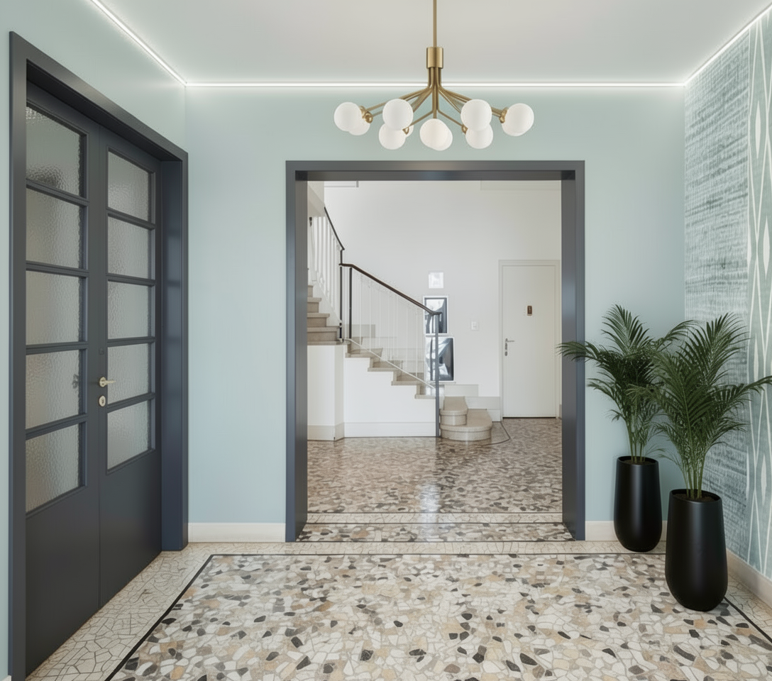 peindre en anthracite l encadrement et les murs du creux dans l ouverture centrale peindre en blanc les murs au fond de l image dans la piece de l escalier agrandir un peu les deux vases avec palmiers les deplacer le long du mur de droite ver l avant de l image supprimer les pots avec le palmier agrandir le pot avec palmier et le centrer sur le mur de droite