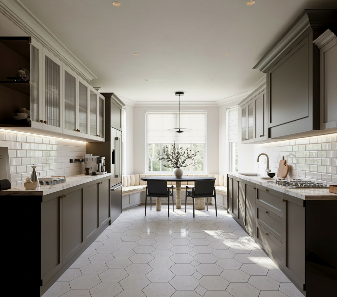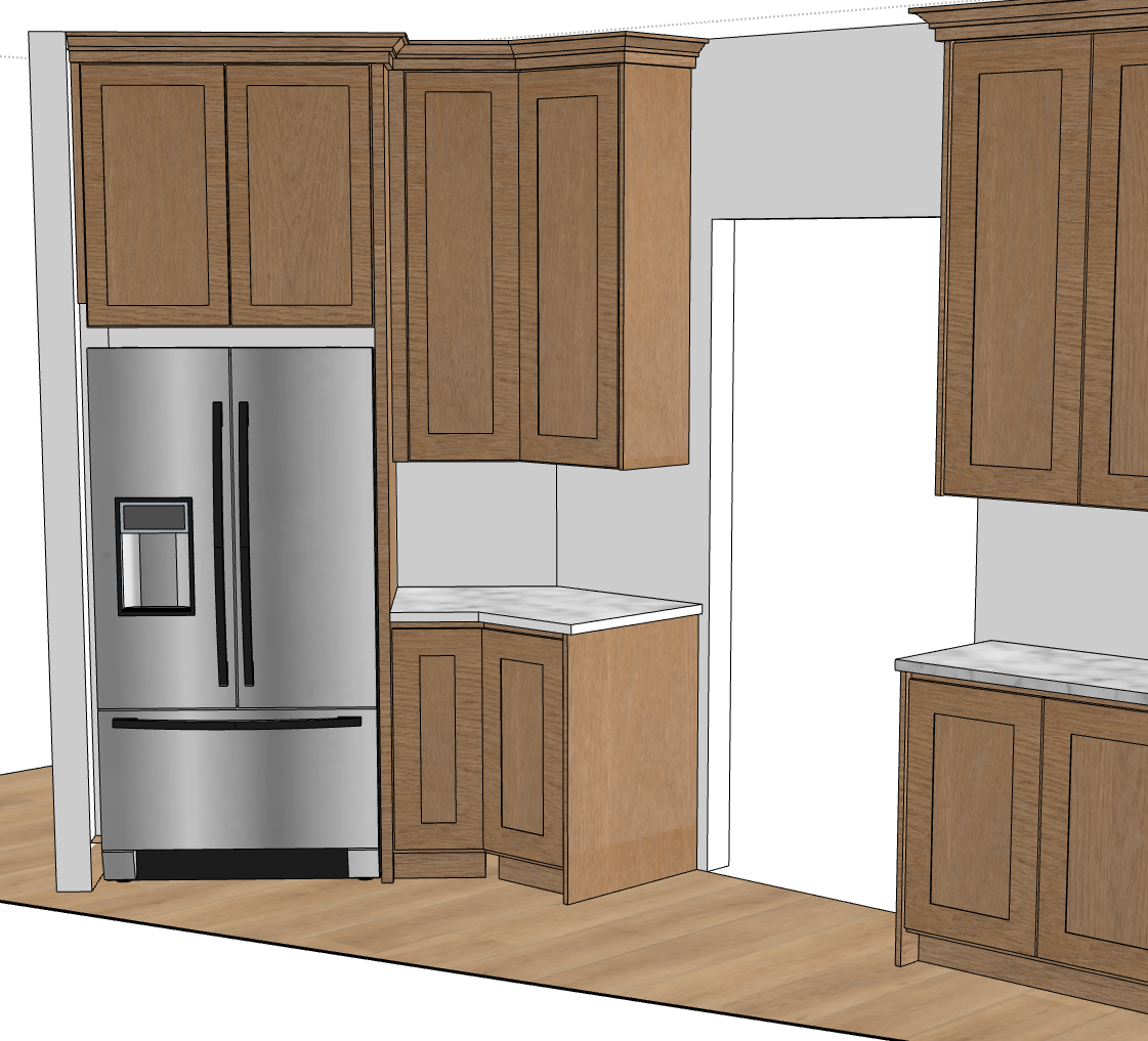 this is a beautiful kitchen with white oak cabinets all the cabinets have matt black 6in handles the countertops are a beautiful white marble the floors are a nice modern medium light lvp wood flooring there is lots of natural light coming from a window behind the camera the door way opens into a great room with a piano