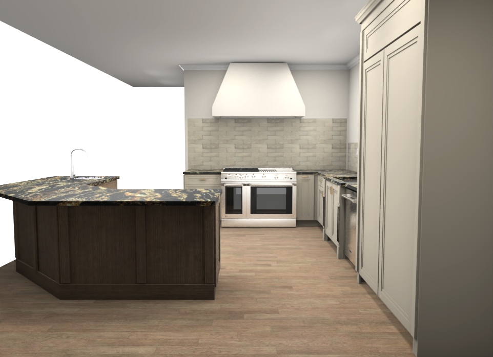 create a hyper realistic image from this kitchen rendering cabinets are accessible beige with a white oak island transitional modern style natural light with sunlight