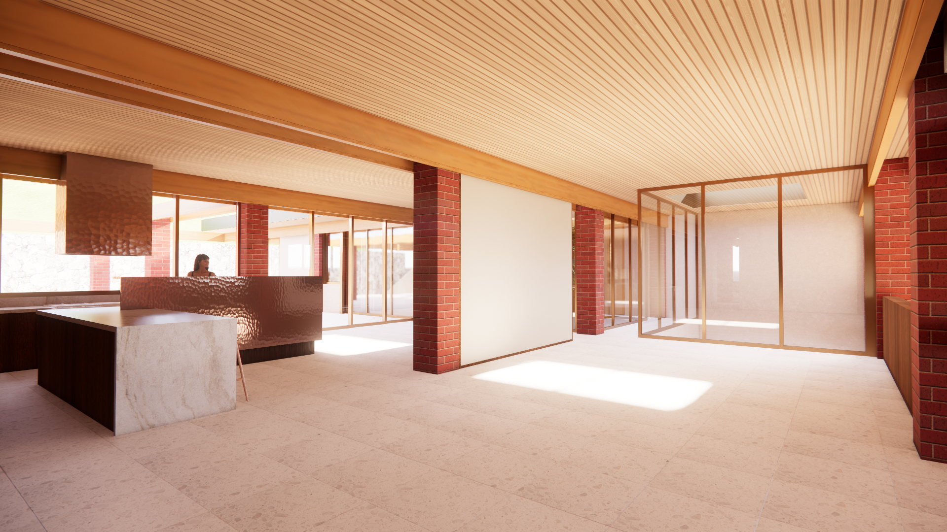 render a photorealistic 3d perspective of this mid century modern masterpiece house keep model geometry the same windows doors roof walls do not change the view only enhance the current materials and add warm sunlight on the floor and make the kitchen look brighter with atmospheric depth render in hyper realistic architectural visualization quality 8k resolution