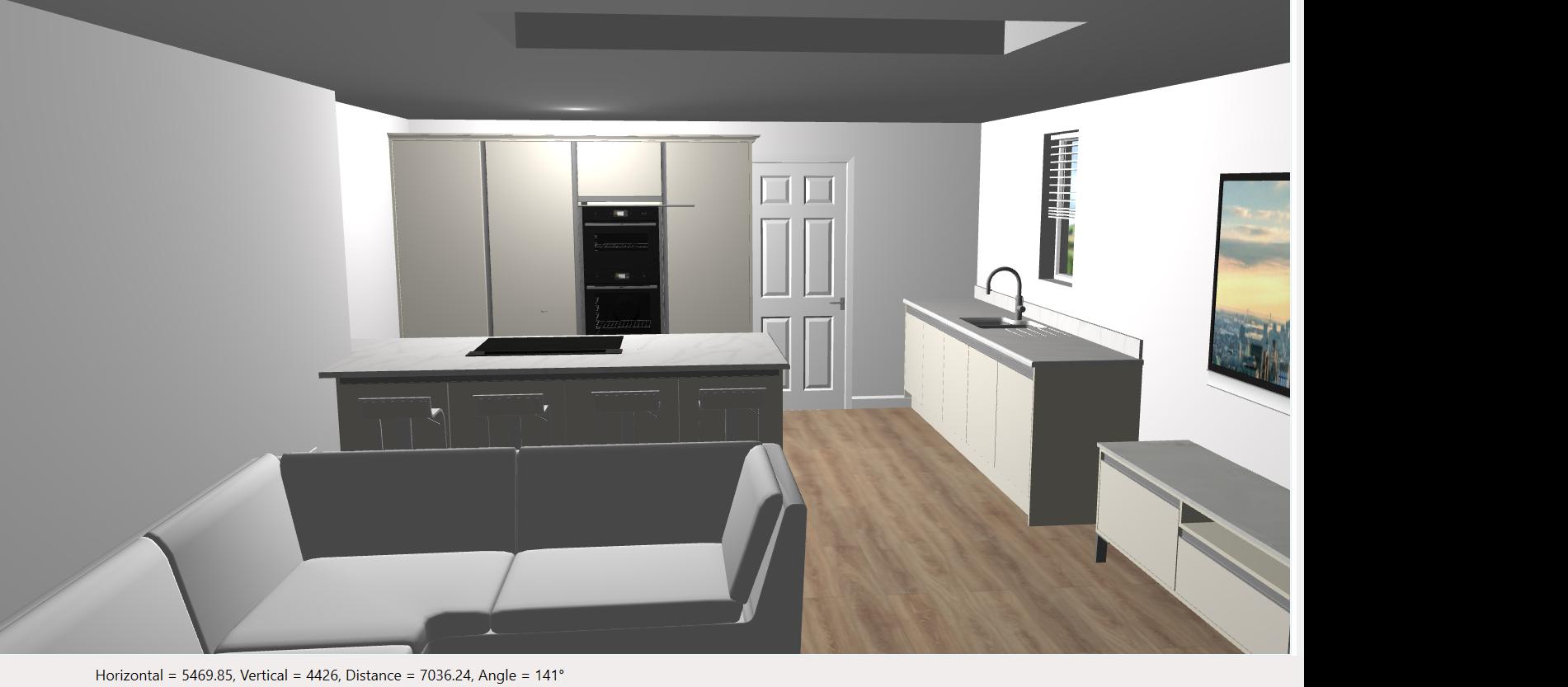 render adding lighting over island linen paint to walls and ceiling spotlights porcelain handleless rail doors to kitchen units with black rails