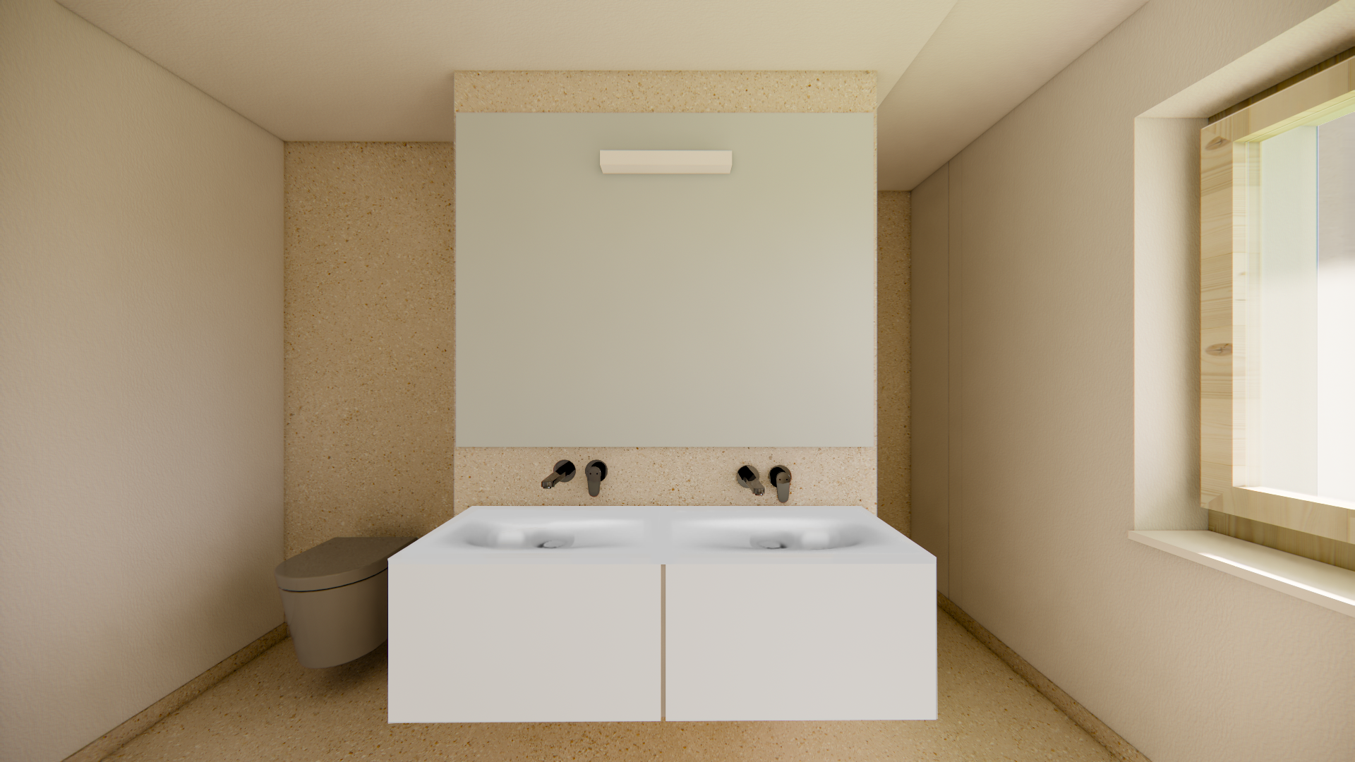 replace the grey surface above the vanity with a real mirror the surface should be a reflective mirror not a panel or wall finish the mirror should show realistic reflections of the bathroom interior do not change any other elements keep architecture geometry materials and proportions unchanged plain construction joints no lighting features at transitions