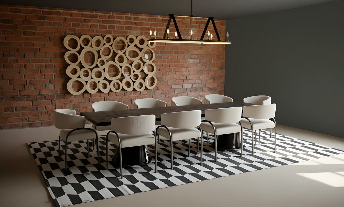 concrete floor big art work place the art work at the side of the wall remove the rugg border double height ceiling
