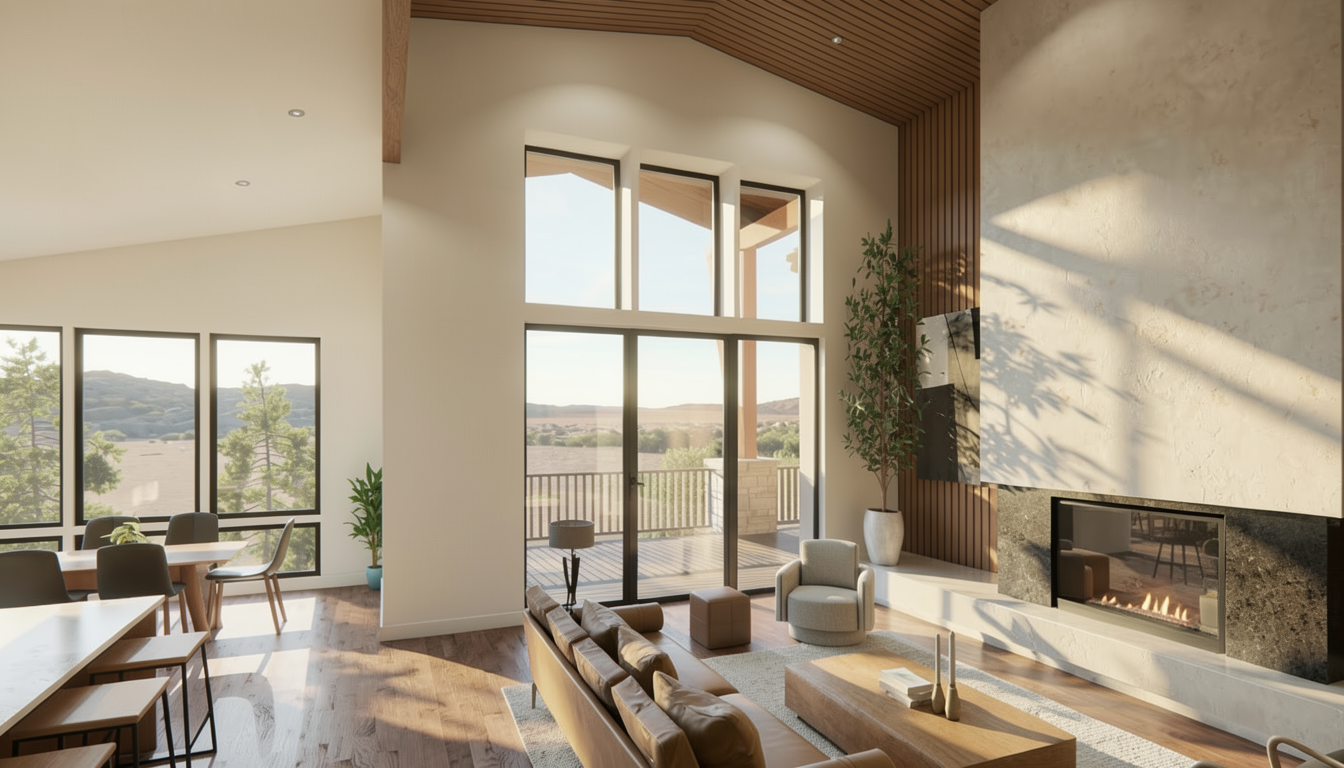 use my uploaded building model as an absolute base strict rules do not change building geometry do not modify massing do not change proportions do not move add or remove windows do not alter the diagonal element do not redesign the volume only change facade materials and lighting keep exact shape and structure from my model facade style modern scandinavian minimalism vertical wooden lamellas in warm copper thermowood tone large transparent glazing with thin dark aluminum frames ground floor upper floors alternate glass and solid panels add subtle led strip along roof edge warm interior lighting sunset clean flat roof edge environment minimal urban context camera keep same camera angle and perspective as original model no reinterpretation