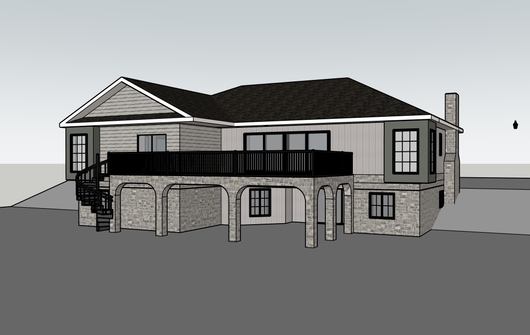 create a stunning image of a modern countryside house the house features elegant gray stone walls with greige siding complemented by a charcoal gray shingled roof the black framed windows and garage doors add a sleek contrast the circular archway and stone chimneys enhance the rustic charm surrounding the house depict a lush green landscape under a clear blue sky the atmosphere is serene and inviting with warm and natural lighting highlighting the details