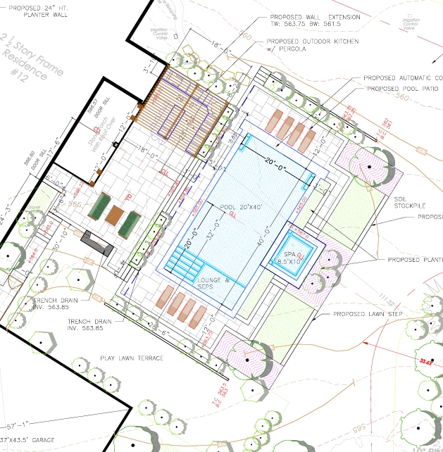 8k rendering realistic of an outdoor living per the layout above with turkish sandblasted marble patio danver kitchen in dark finish modern fireplace black plaster pool walls in finished stone veneer square and rec with blue and gray tones plantings and landscape per the design of a house placed in armonk ny