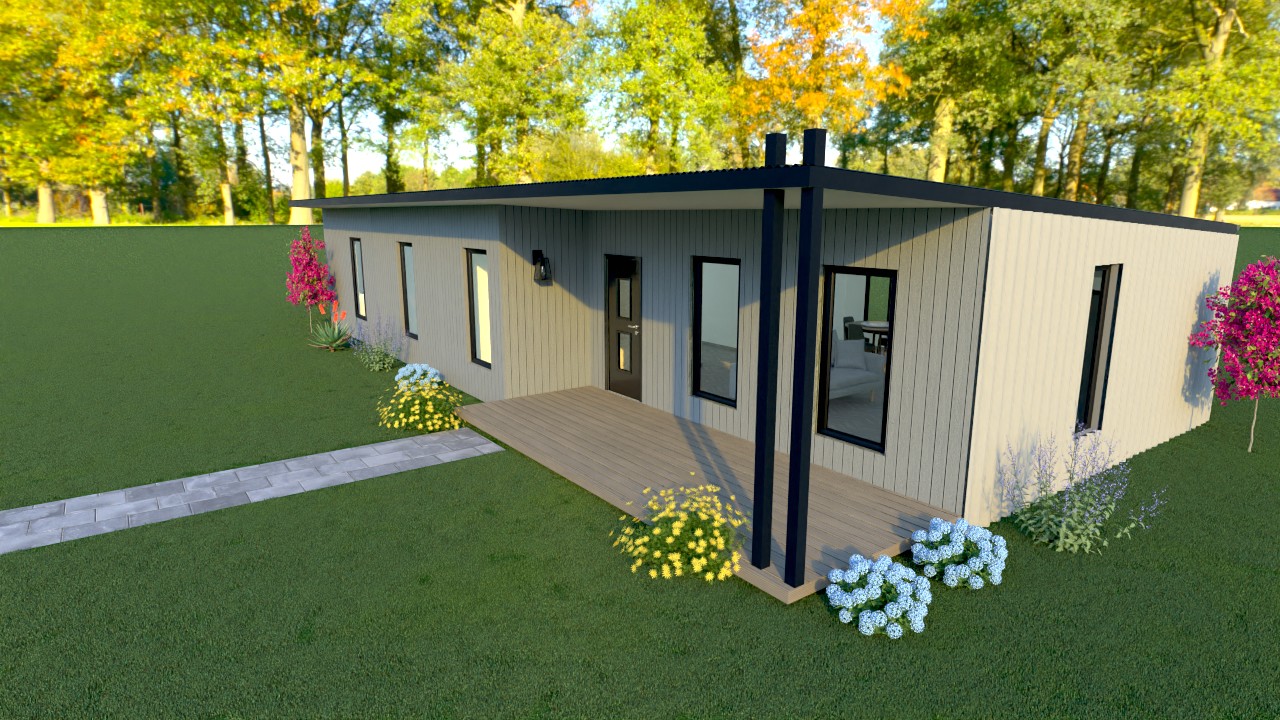 render a modern house with light grey wooden paneling and black accents the roof is flat and black with a sleek minimalistic design the landscape around is lush and verdant with rich green grass place vibrant pink flowers near the house contrasting with bright yellow and soft white flowers along the path which consists of gray stone tiles the atmosphere is serene and inviting bathed in the warm glow of a late afternoon sun filtering through tall green and orange autumn trees in the background
