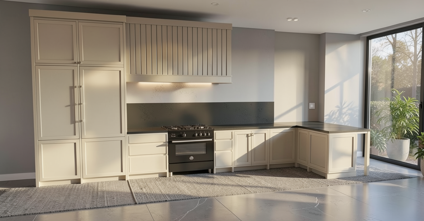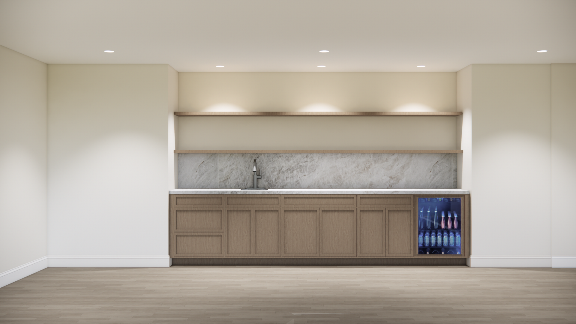 convert this architectural rendering into a highly realistic editorial style luxury real estate photograph absolute constraints no creative liberty maintain the exact architecture layout cabinet proportions countertop thickness backsplash configuration plumbing locations flooring layout and all materials exactly as shown in the input rendering do not redesign restyle reinterpret enhance or modify anything do not add d cor bottles bar accessories styling elements cabinet hardware lighting fixtures trim details or architectural elements do not remove anything flooring flooring is builddirect westport wide plank hardwood maintain exact plank width direction and layout as modeled finish must match the provided reference matte to ultra low satin sheen no gloss no reflective shine soft natural oak tone subtle grain movement light tonal variation between boards no heavy contrast surface should appear smooth and natural not polished not waxed not plastic do not increase surface reflectivity cabinetry cabinets are wood stained preserve exact stain tone and undertones as modeled do not lighten darken or shift color temperature wood grain should appear realistic with natural depth and subtle variation finish should read matte or soft satin not glossy countertops backsplash countertops and backsplash are taj mahal honed quartzite maintain exact slab layout and veining scale as modeled finish must read honed soft matte refined no artificial shine no exaggerated veining no color reinterpretation preserve edge thickness and profile exactly as shown material fidelity preserve plumbing fixtures and appliance finishes exactly as modeled do not upgrade or alter appliances lighting use natural interior daylight if windows exist if no windows use balanced architectural lighting consistent with the rest of the home photography lighting should feel clean and evenly diffused no dramatic shadows no heavy contrast no moody tones maintain consistent white balance with the other interior images of the home realism enhancements lighting texture only increase realism through accurate surface roughness subtle shadowing at cabinet joints realistic wood grain depth soft honed quartzite reflection control natural light falloff maintain straight vertical lines no lens distortion no hdr exaggeration no artificial sharpening photography style professional luxury real estate photography full frame dslr 28 35mm lens eye level perspective balanced exposure clean white balance soft highlight roll off crisp natural focus the final image should feel extremely realistic refined and cohesive with the kitchen bathroom and terrace imagery
