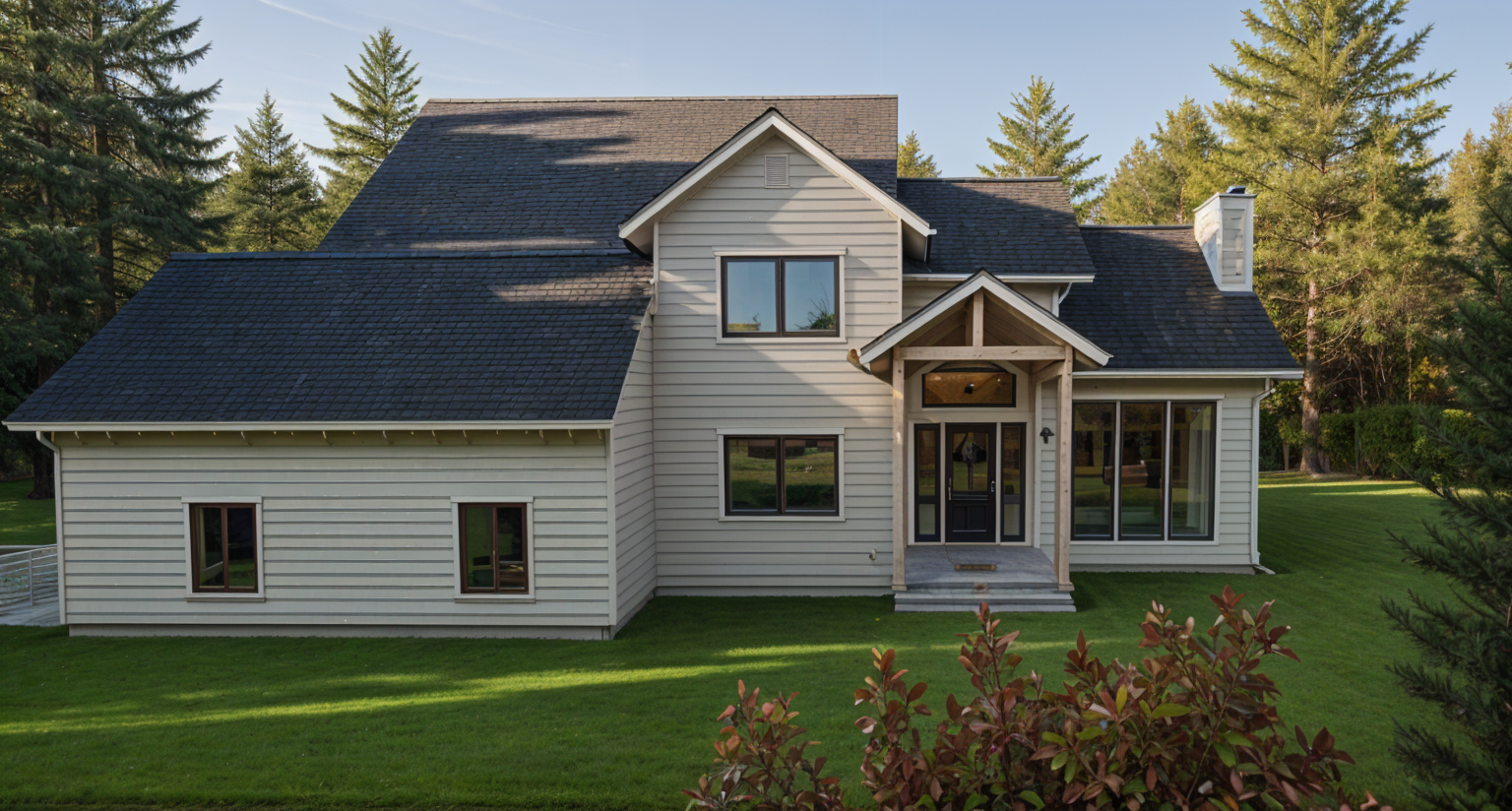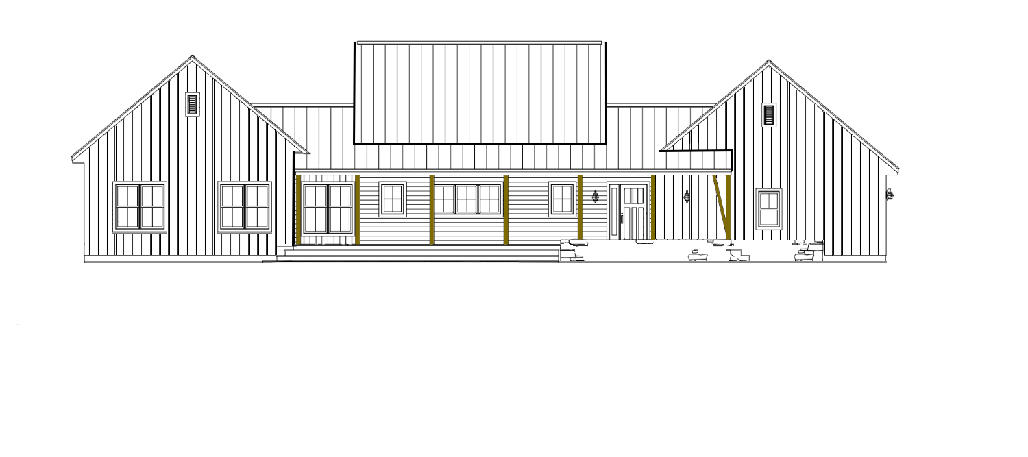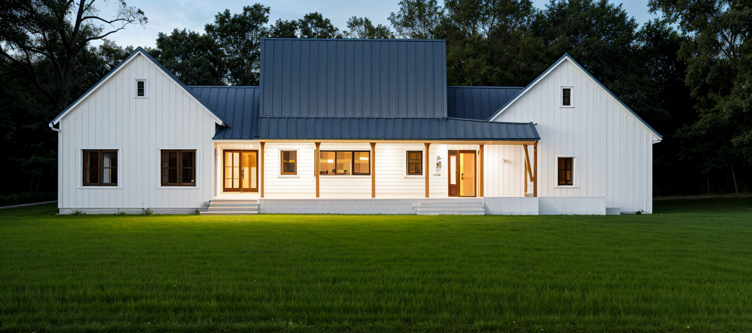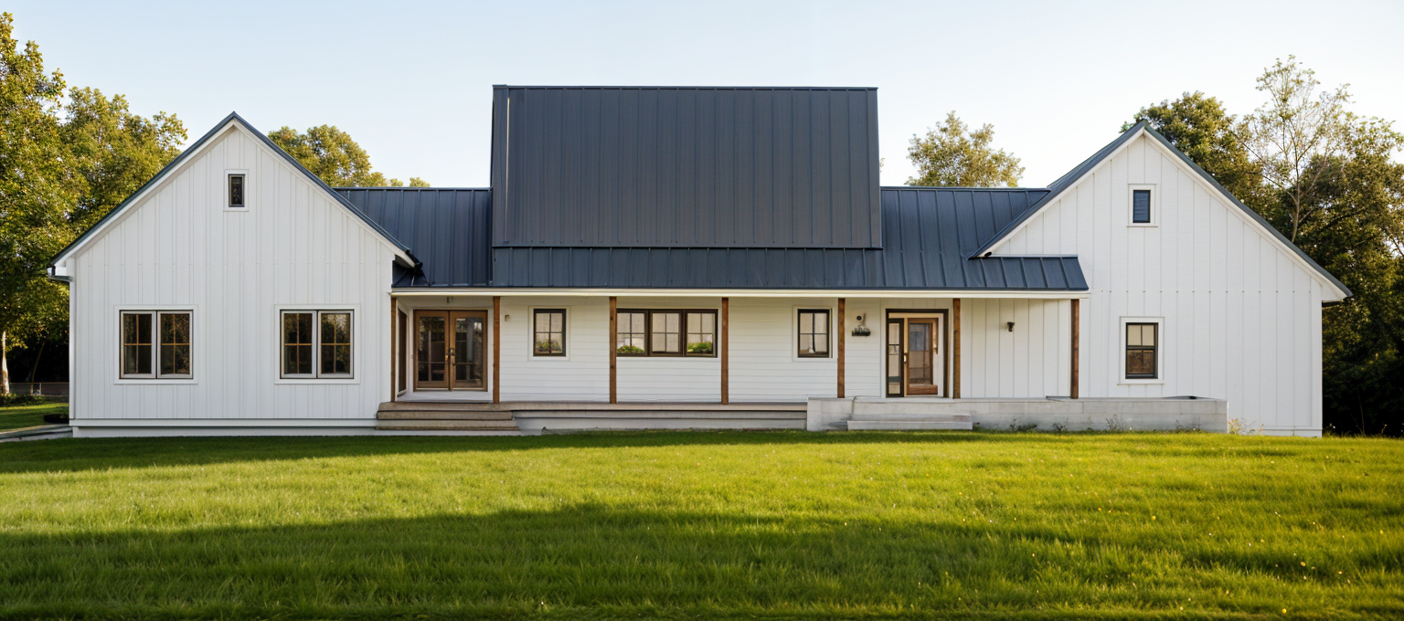 white board and batten siding darker gray metal roof green grass yard trees background add two dormers to top roof