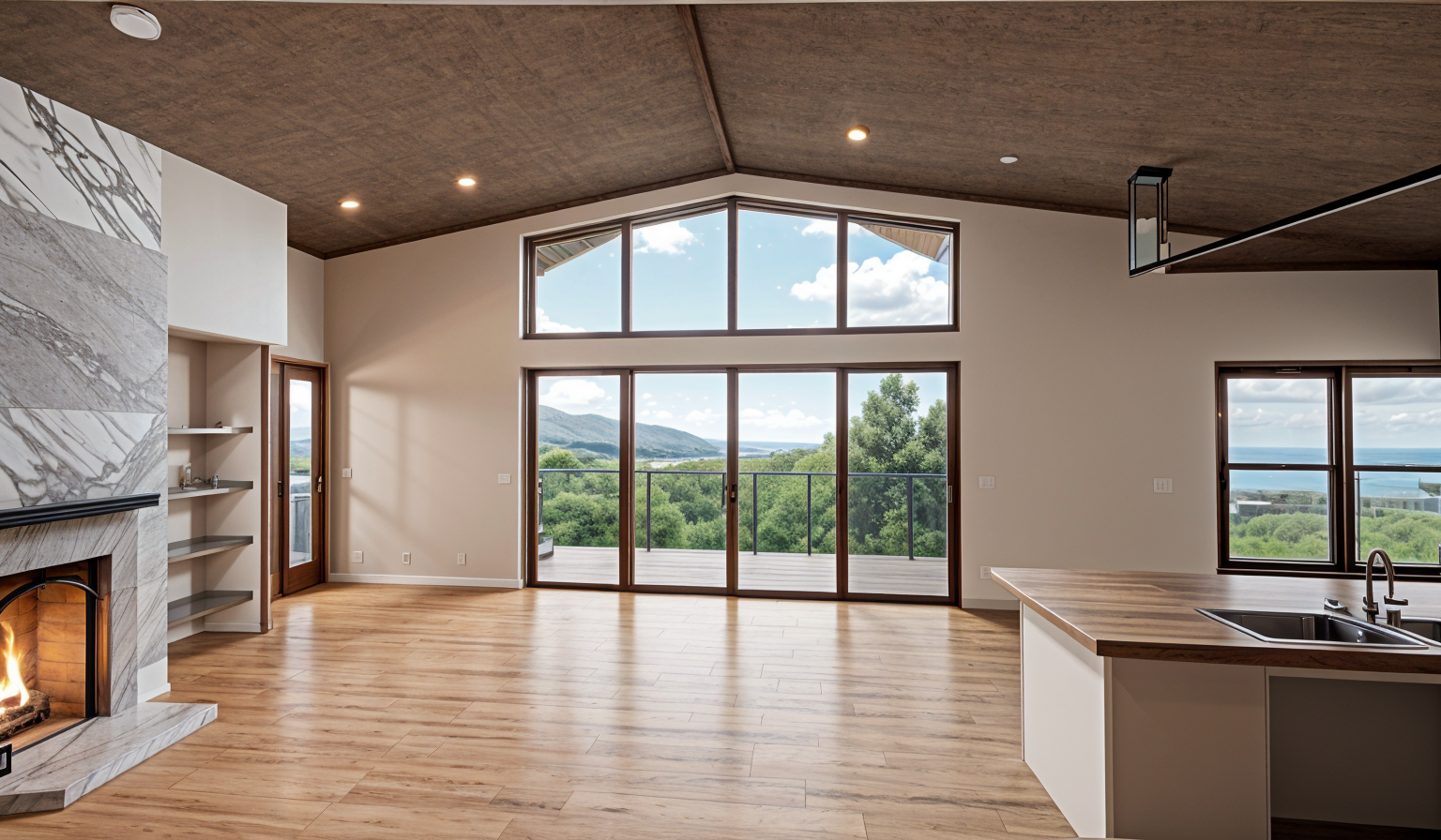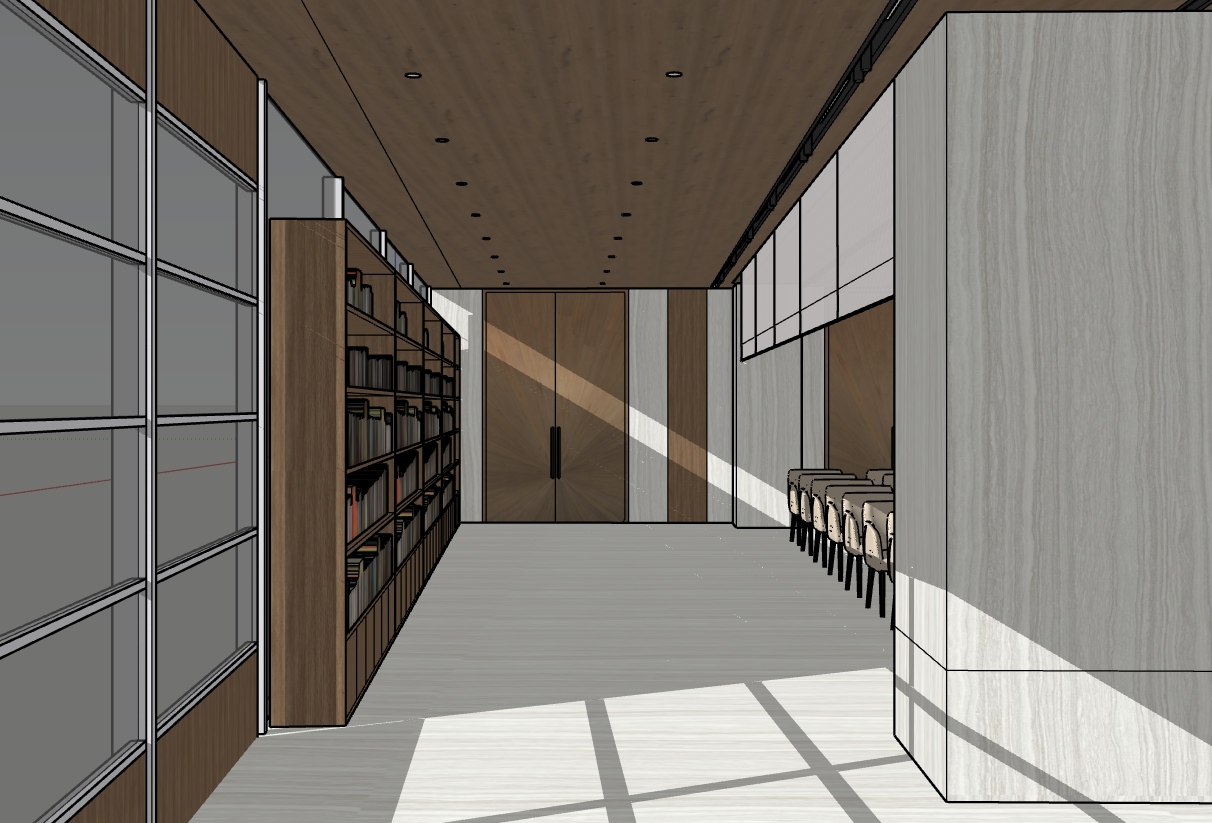 modern interior room with a minimalist aesthetic featuring large wooden panels in warm rich brown tones as a focal element the panels are complemented by sleek vertical stone accents in a soft grey hue the floor is a light grey wood harmonizing with the grey ceiling beams and panels overhead integrated soft ambient lighting emanates from the wall bases casting a warm inviting glow in shades of soft yellow the shelving units also in a matching wood grain add depth and symmetry the overall atmosphere is serene and sophisticated inviting natural light to create dynamic shadows