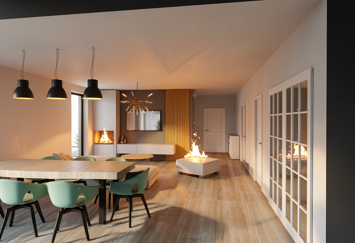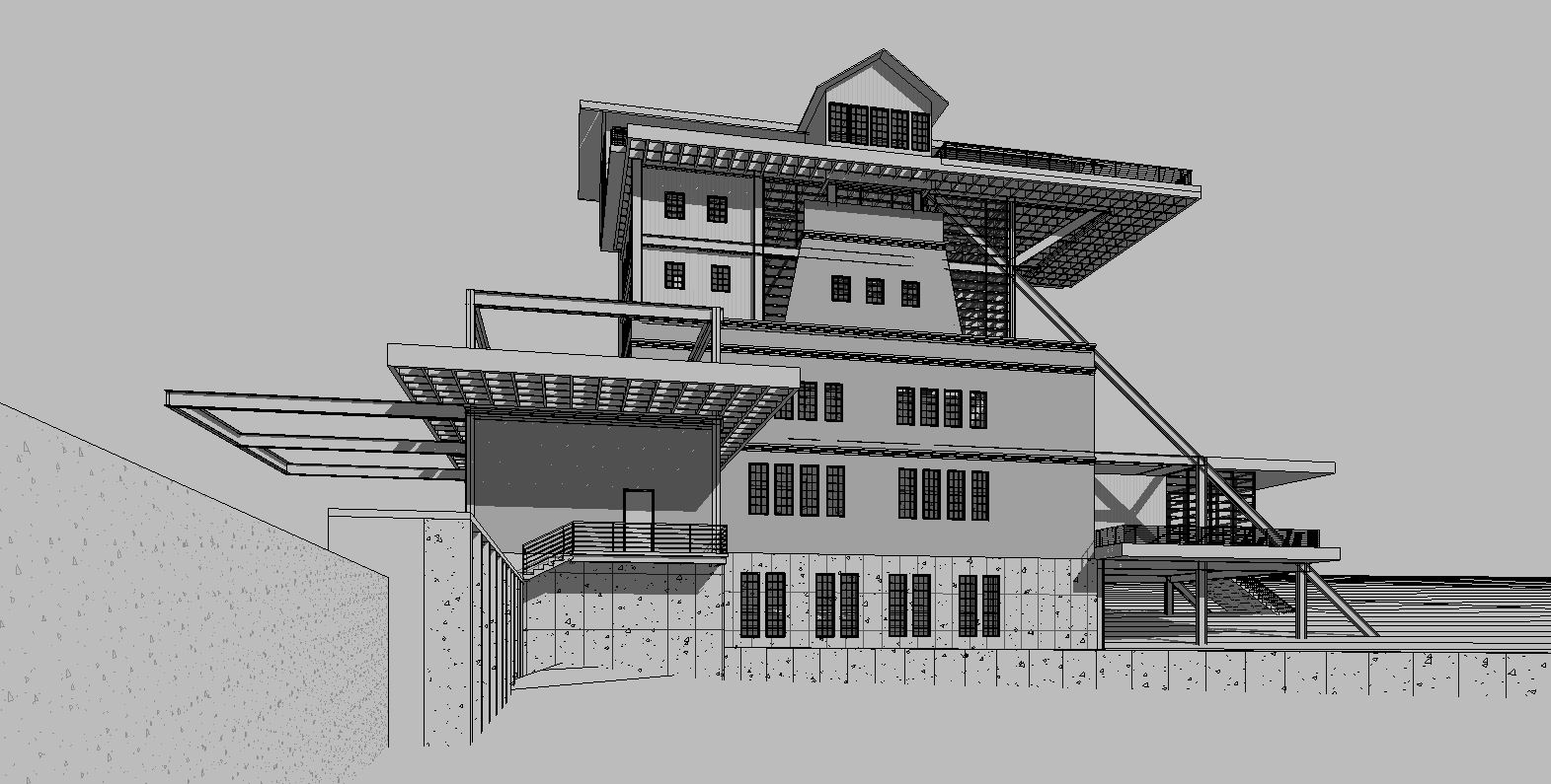 industrial building brick building with concrete panel foundation vertical dark shiplap river with dam foreground trees in background soft interior lighting