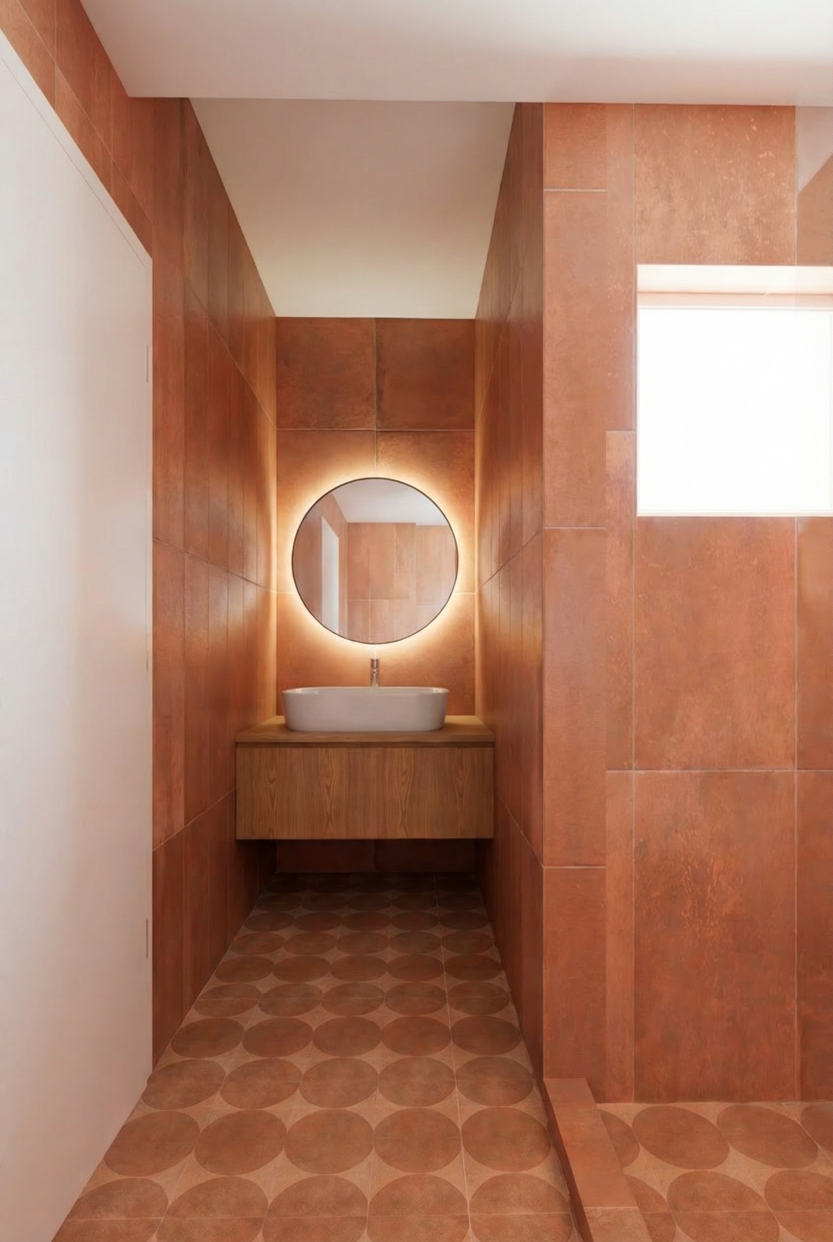 reduce the intensity of the light behind the mirror reduce the grout not so visible add more ambient light