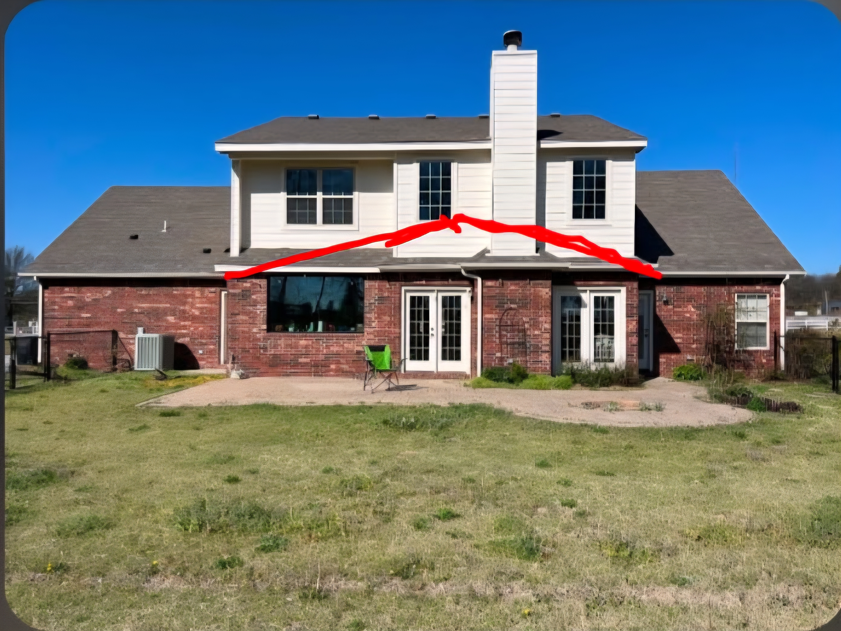 add large concrete patio with 4 cedar posts with patio furniture and roof covering only as high as the brick with a gable roof