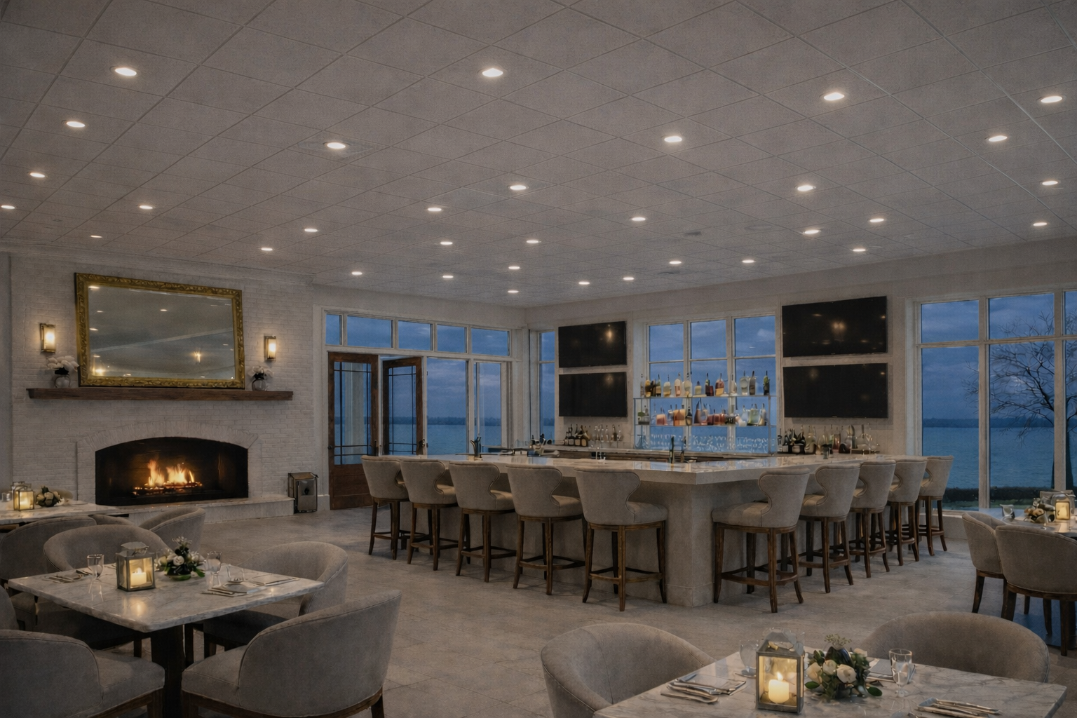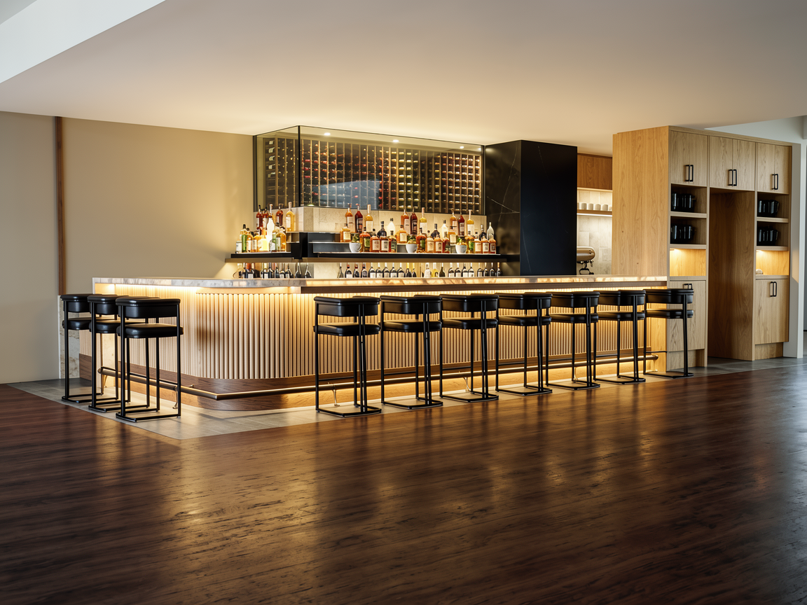 remove the lighting on the ceiling redo the recessed lighting on the ceiling evenly spaced natural warm pendant lights above bar don t change anything else