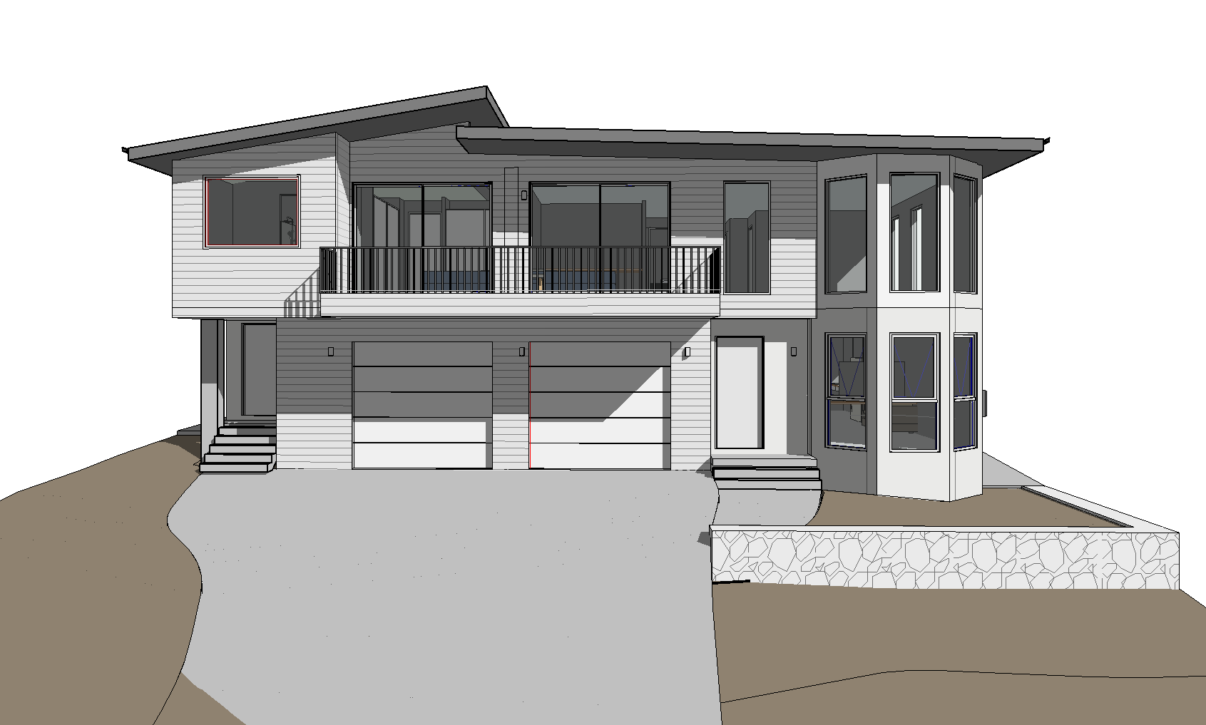 a modern two story house with a sleek design featuring a slanted roof the exterior walls are a soft white with white window frames and railings the windows are expansive providing a sense of openness the driveway is a soft neutral gray leading up to garage doors with light oak timber batten cladding the balcony railings are a frameless clear glass the surrounding landscape is dense shrubs groundcovers and trees nissan gtr r35 in the driveway with two people on the balcony skies little cloudy with sun hitting the facade with light atmospheric depth render in hyper realistic architectural visualization quality 8k resolution tall double storey christmas tree inside the right hand side double storey windows