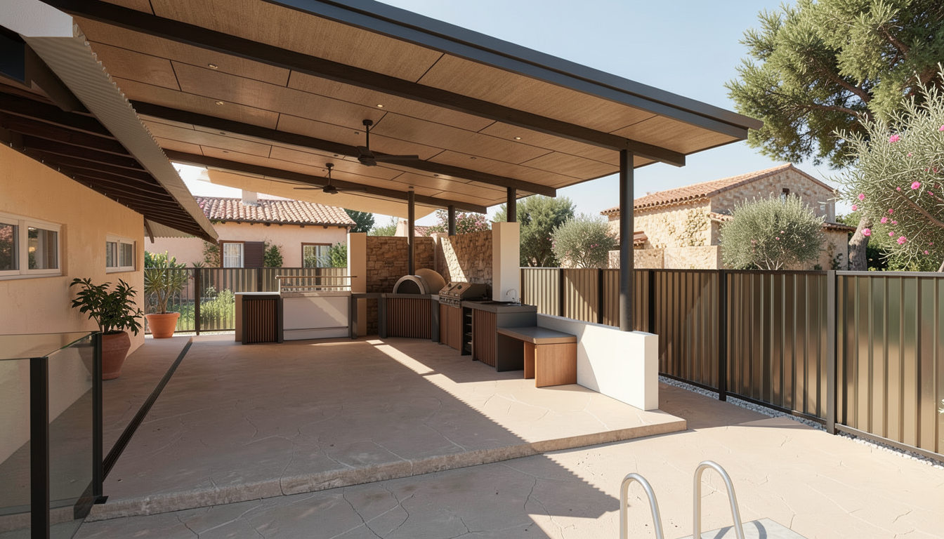 add outdoor lounge mediteranian feel white washed walls metal colourbond fencing in light cream colour black coloured beams black coloured fence posts