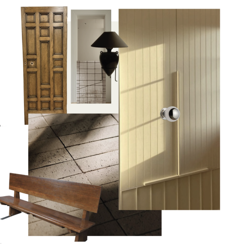 exterior shot the cubbies on teh right should be a light yellow with shiplap panels the floor is a grid pattern natural brick in a medium red brown tone add the lamp on the side table next to the church pew paint all the walls and ceiling light yellow including the window frames and mullions except for the door at the end