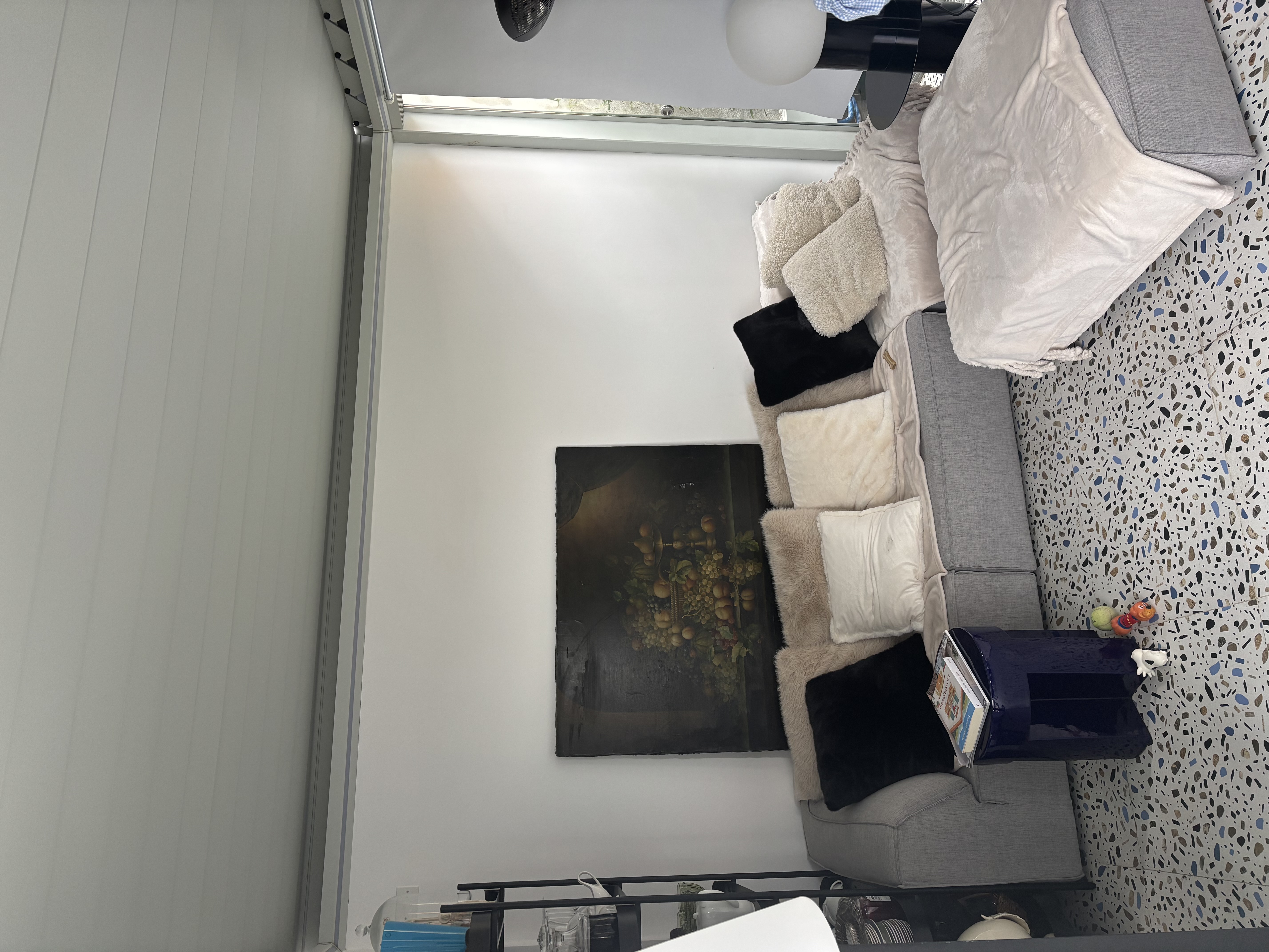 remove art and add a composition of round mirrors with natural edges and a rattan round rug add an ac unit on the top of the wall in the centre