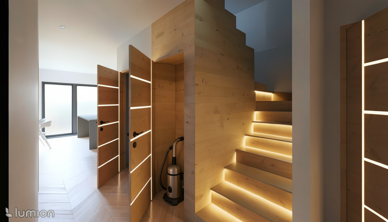 ud lej z t to fotky vizualizaci maxim ln realistickou schodi t a m podsv cen n lapy do m stnost pod schodi t um sti modern vysava eta a mop