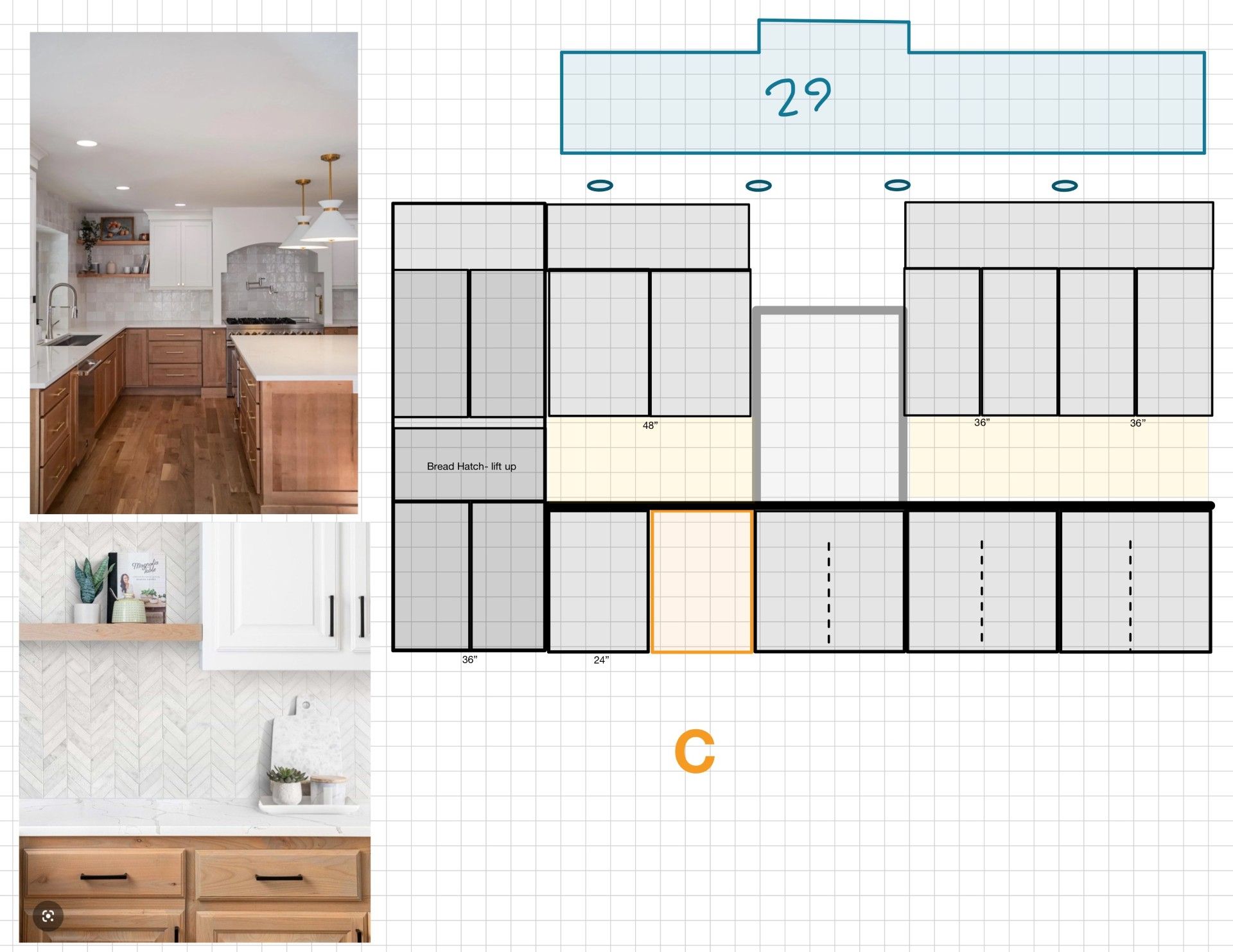 using this sketch of a cabinet elevation apply the light stain grade cabinet style and the white painted wall cabinets with whit quartz countertops to generate a concept rendering ignore the blue shape above cabinet hardware should be brushed brass gold anthe the square in the middle of the wall is a passthrough window to the outside back yard deck