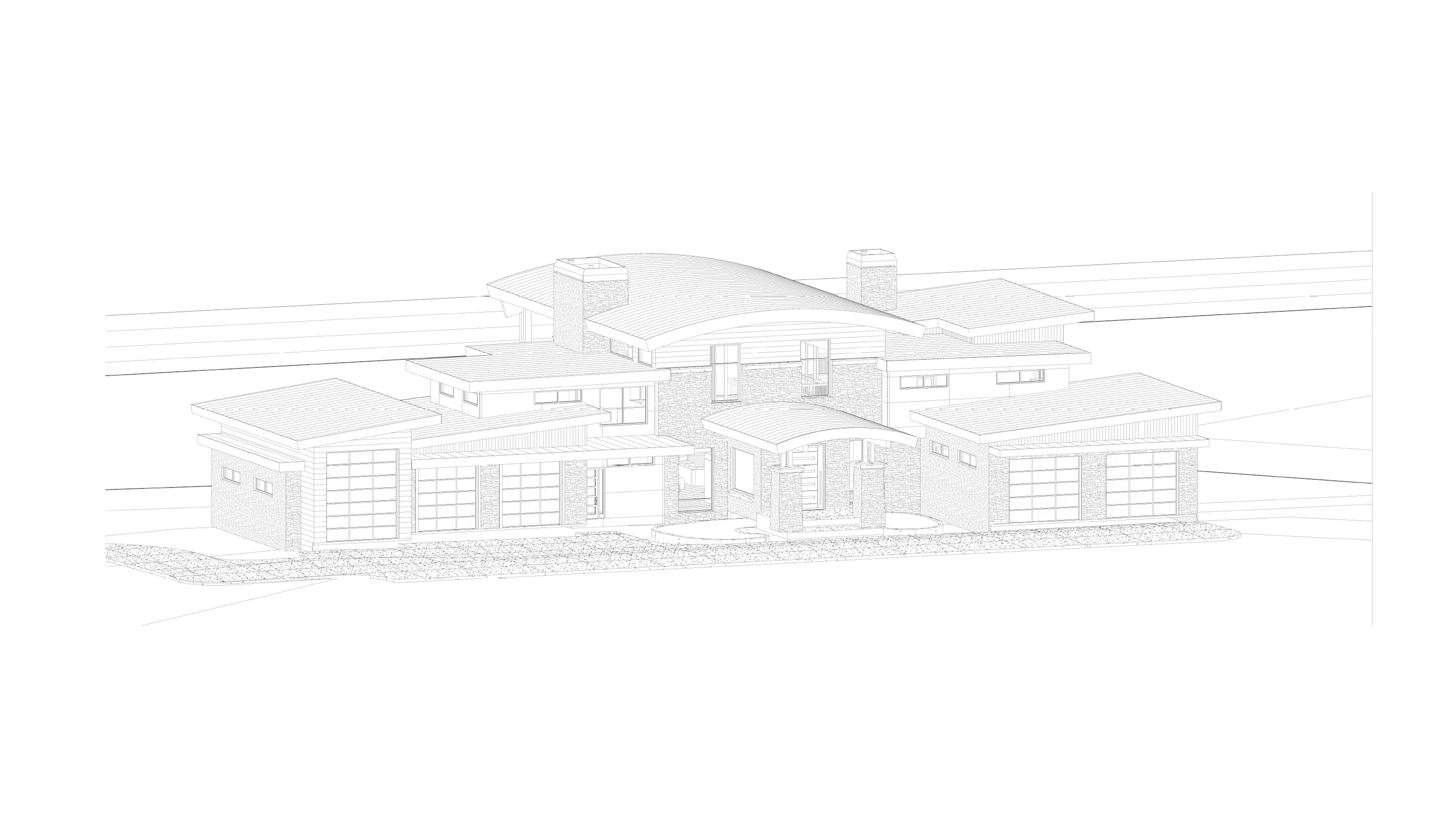 clean modern architectural exterior rendered in cinematic vibrant golden hour lighting with blue skies mountain modern with heavy timber architectural style stone siding beautifully lush green manicured landscape around structure with hedges and gardens black standing seam metal roof prominent cinematic oregon coastline with big douglas fir trees surrounding the house and the coastline in the distant background high fidelity photorealistic visualization crisp shadow falloff refined facade geometry soft atmospheric depth premium architectural photography mood ultra clean composition and materials dark trim around windows