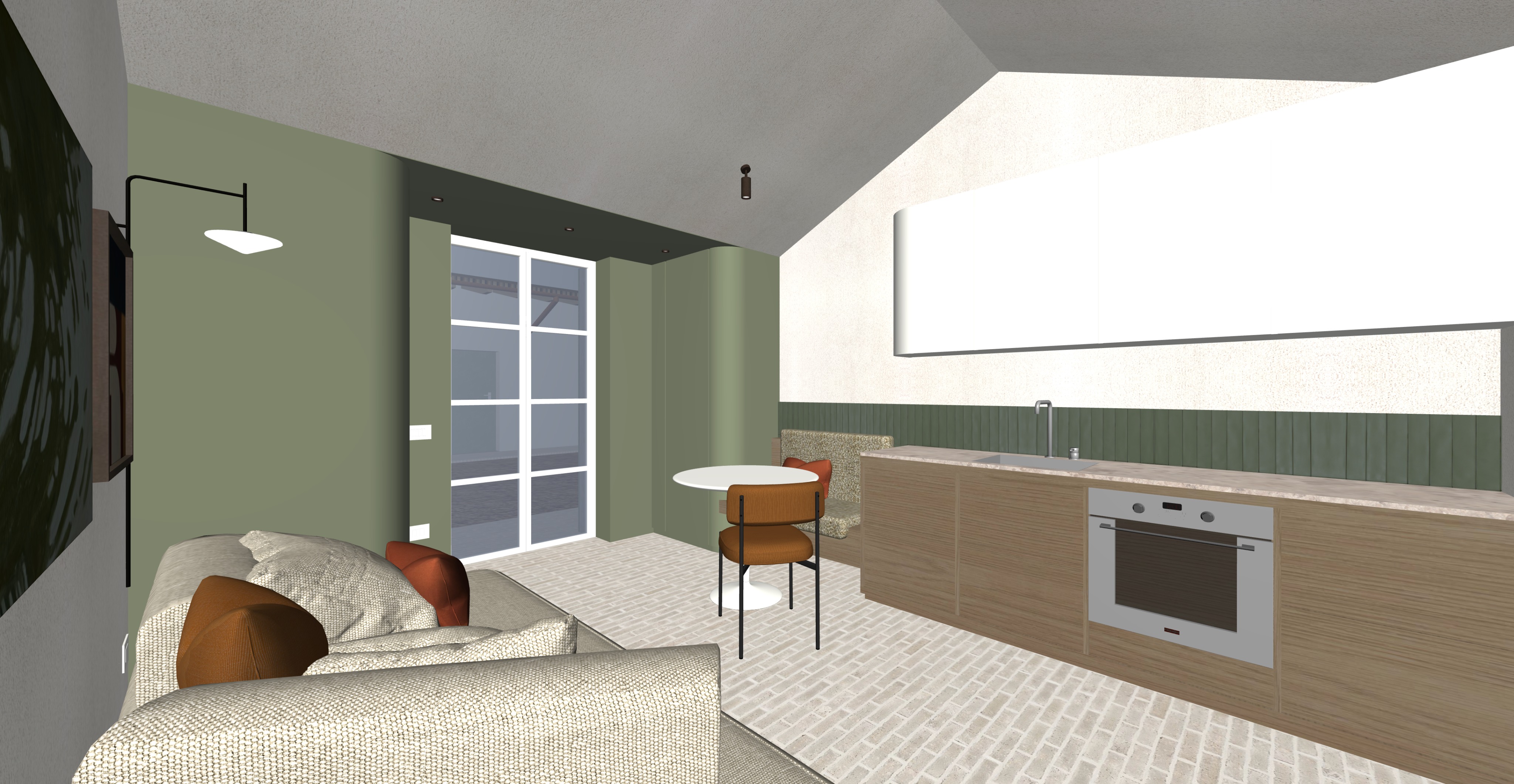 le pareti sono intonacate bianco caldo mantieni tessuto divano aggiungi strip led sotto pensile cucina mantieni pensile cucina laccato bianco aggiungi qualche oggetto sopra il top cucina mantieni colori tessuti luce della scena tardo pomeriggio lavabo e rubinetto in acciaio spazzolato tavolo laccato bianco opaco mantieni mobile ingresso laccato verde accendi luci ma mantieni luci 3d