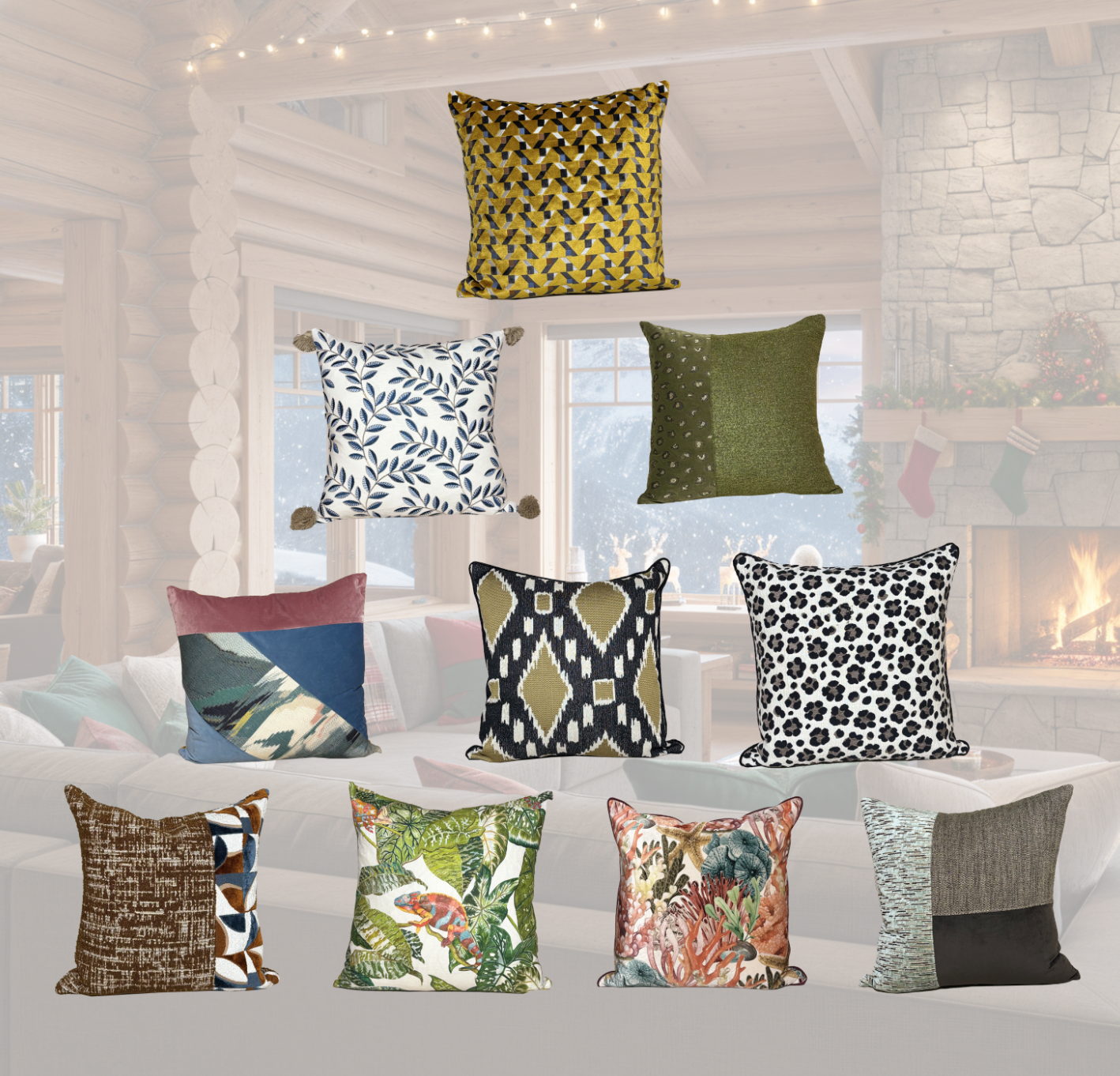 interior shot christmas tree made of cushions in a wooden house with a fireplace and a view outside where snow covered mountains can be seen