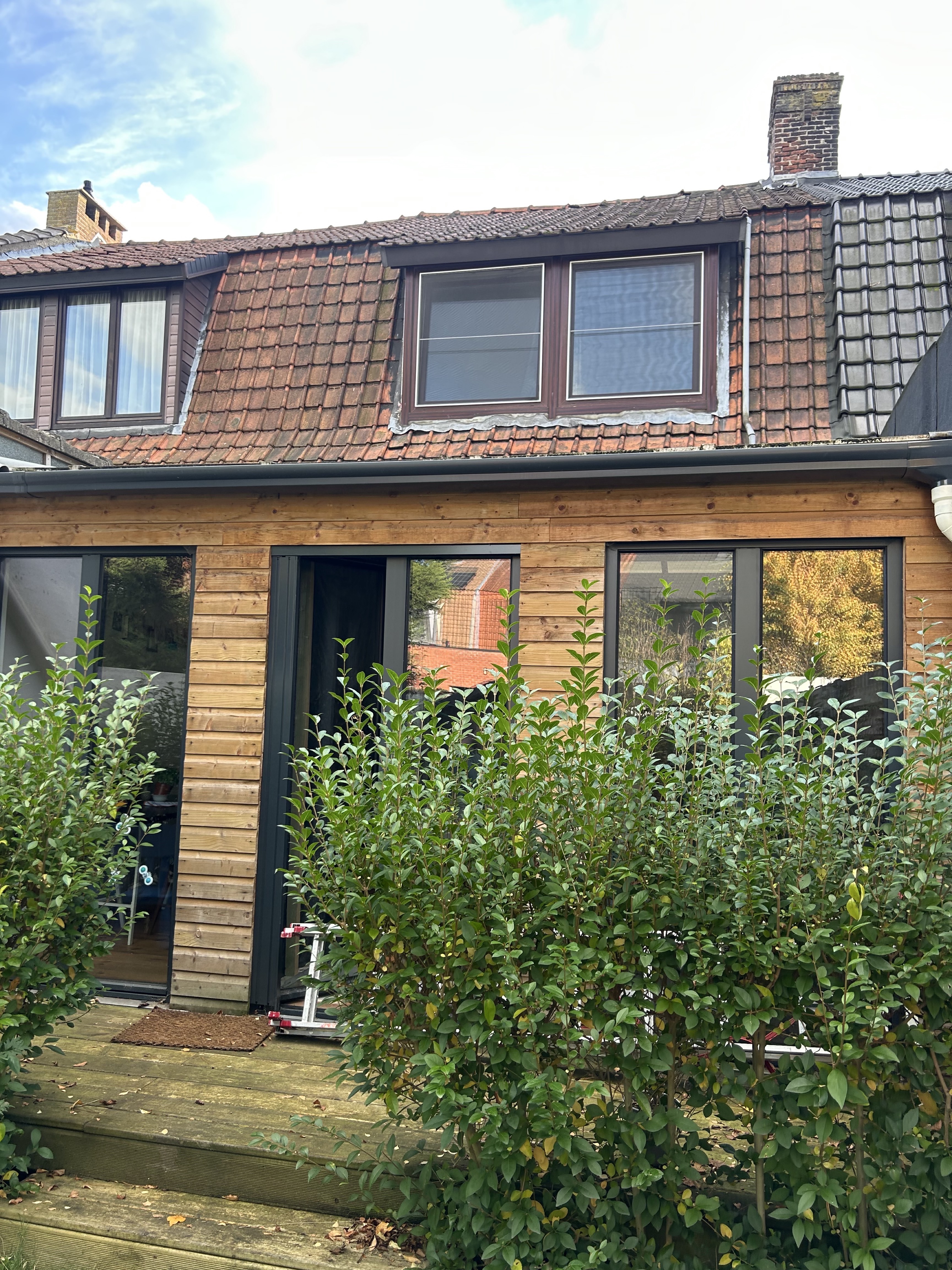 exterior shot the roof will be renewed with new red tiles a rear extension with a flat roof will be added featuring a black wooden facade there will be 3 tall windows in the rear facade