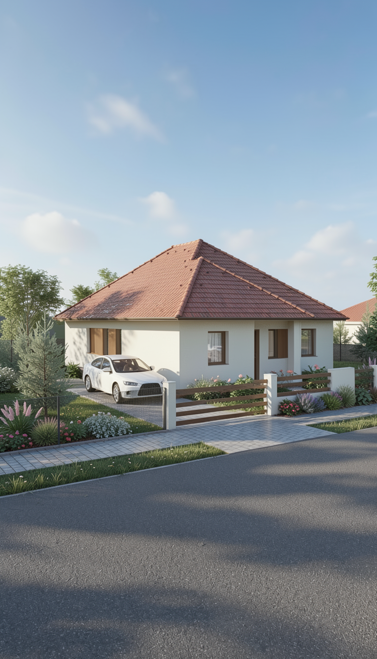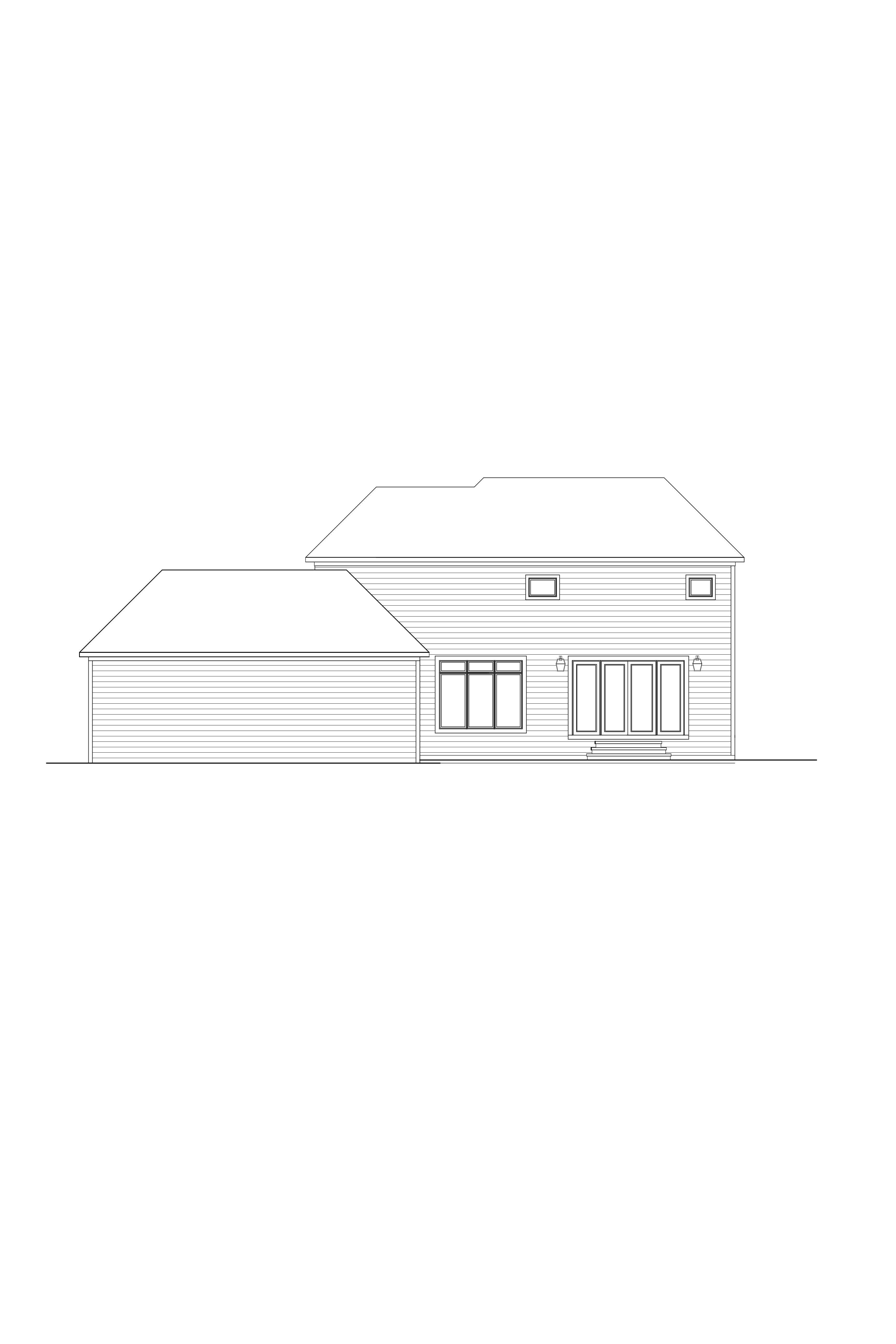 render elevation with off white painted brick off white standard shutters sand tone aluminum windows dark charcoal roof medium tone oak front door dark bronze metal porch roofing off white porch trim color show boxwood bushes in front and driveway on right side medium oak color garage door