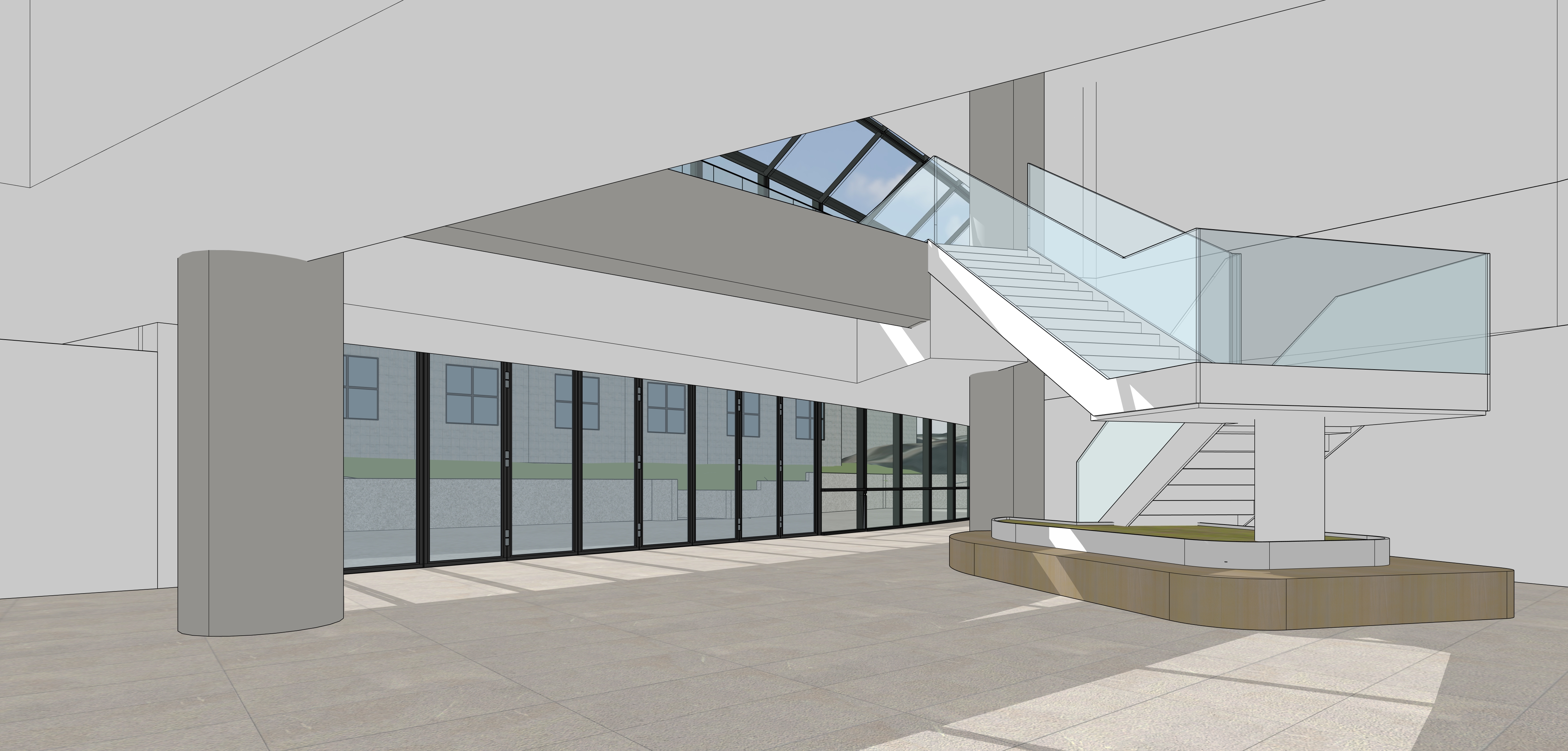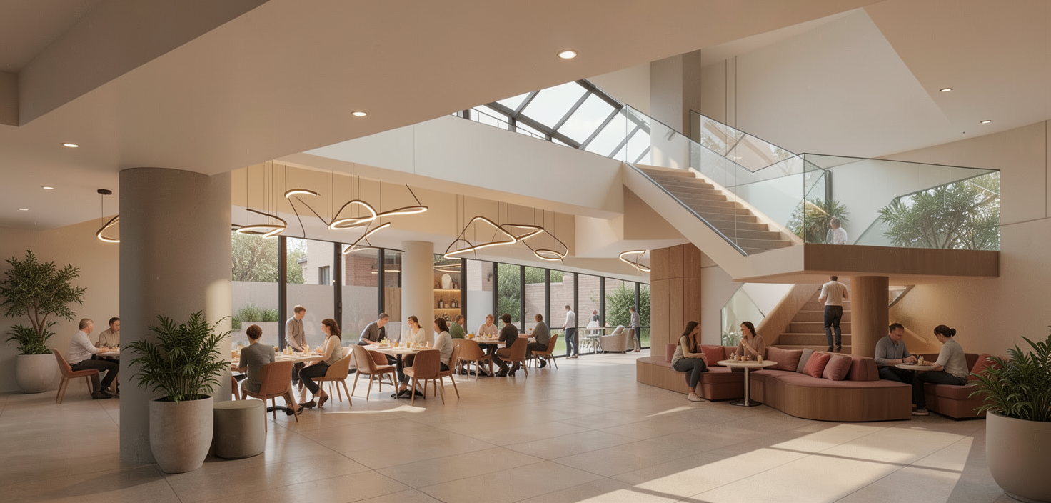 renovate interior office collabation cafe soft seating warm wood tones curved feeling seating under stair add light fixtures and people window opening nanawall that is open patio outdoors add seating planters