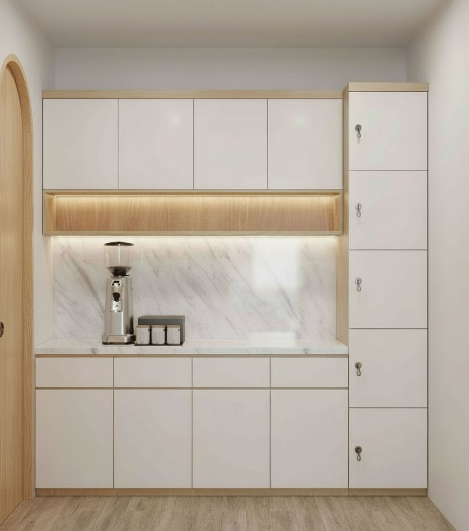hapus lemari atas dan backplash cumja tingga lemari bawah dan lemari loker sebelah kanan tanpa merubah material dan renderannya