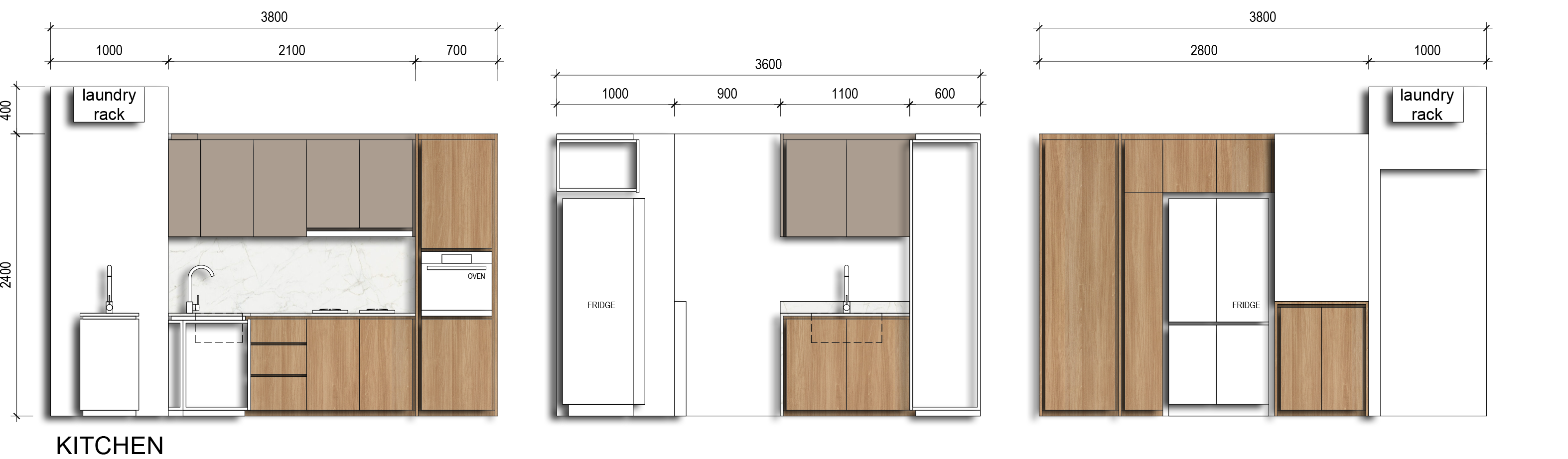 realistic rendering of this sketchup view of a kitchen top cabinet in beige and bottom and tall cabinet in oak