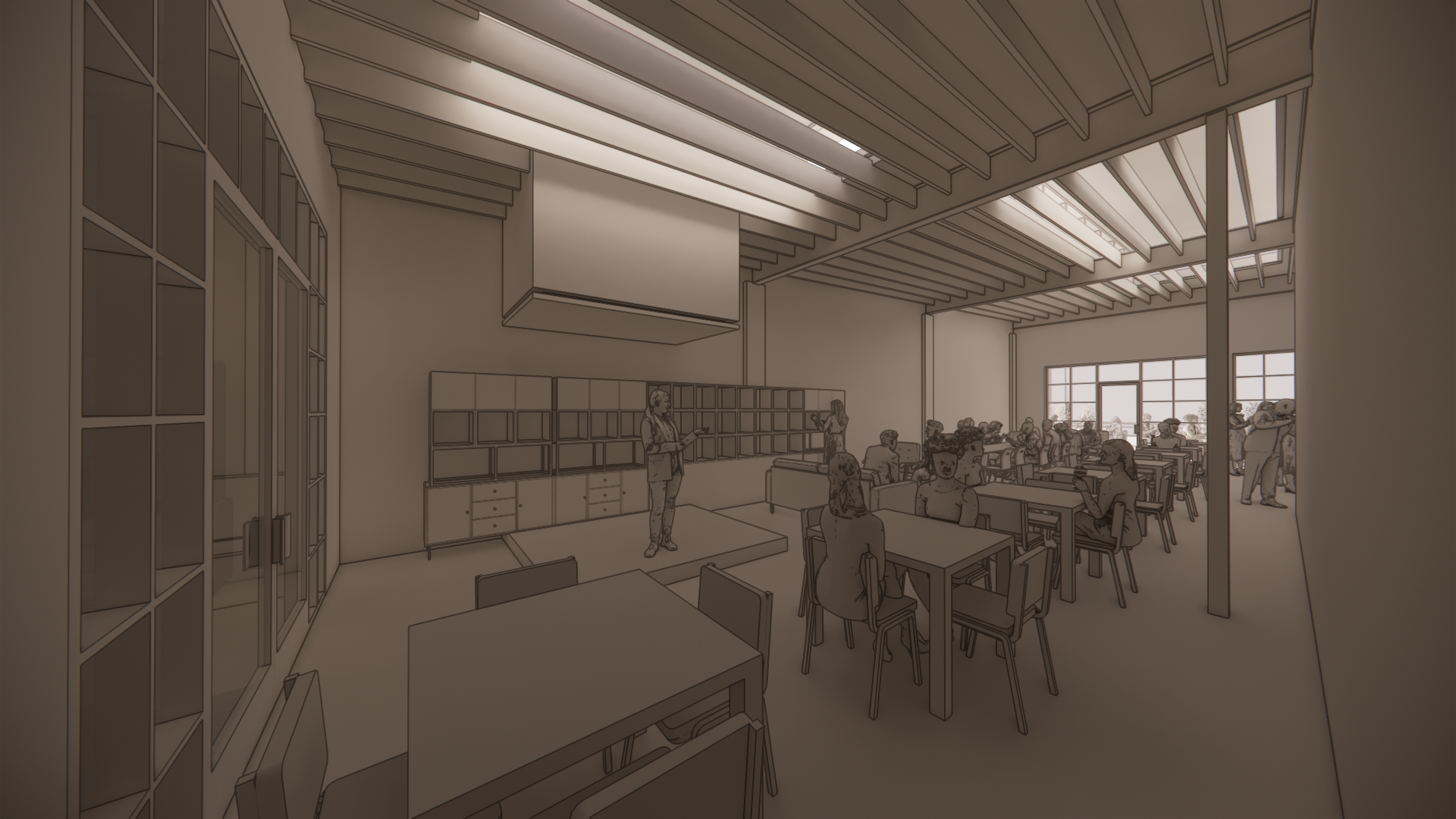 caf scene at night with warm and inviting atmosphere walls in soft cream and black and white accents wooden tables and bookcases in rich mahogany chairs with dark green cushions people casually dressed with a variety of clothing colors and lush greenery in pots dark night time windows with black frames modern lighting casting a warm glow calm and relaxing ambiance