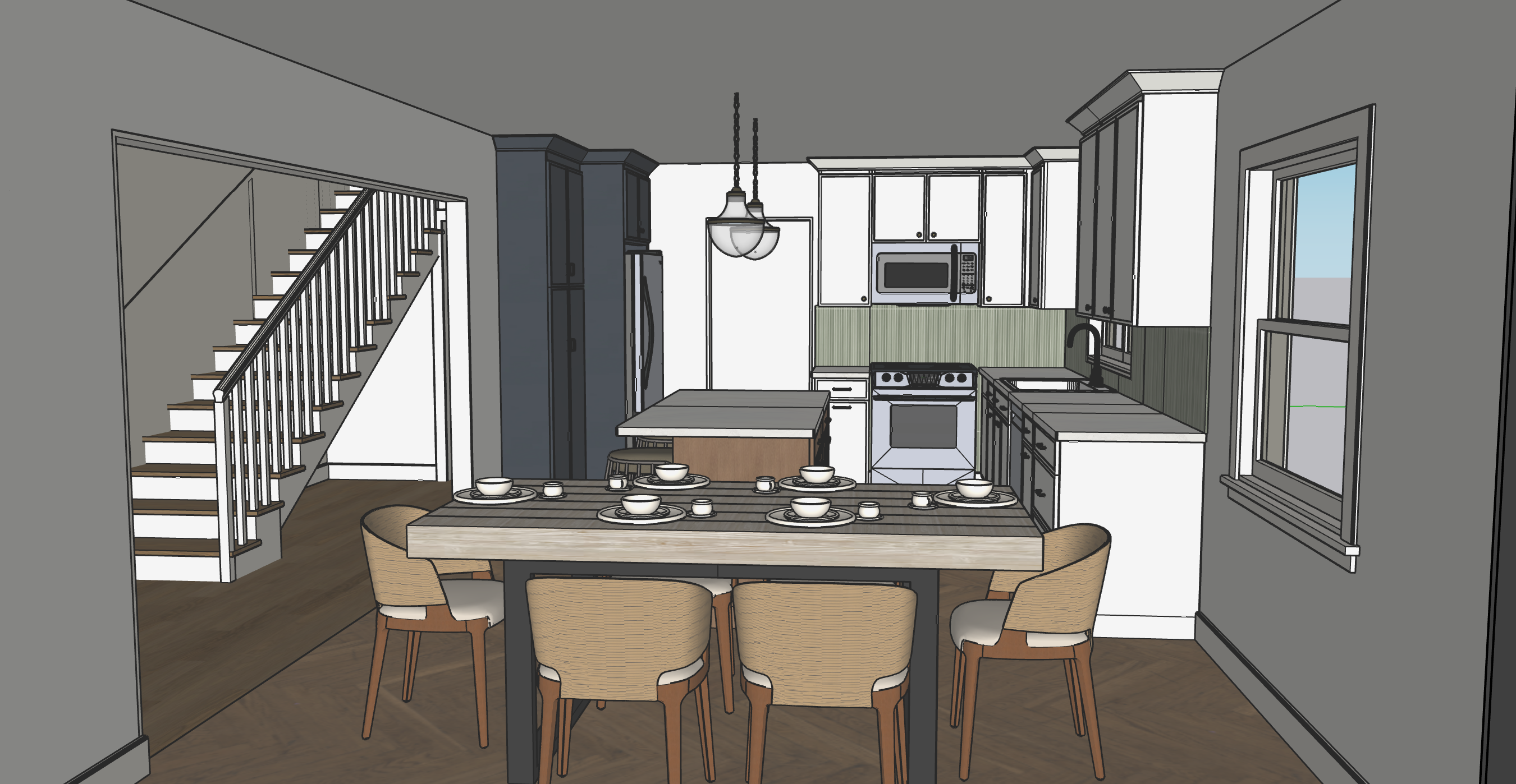 keep everything the same the outside environment is bushes and a house make the cabinets a skinny shaker frame