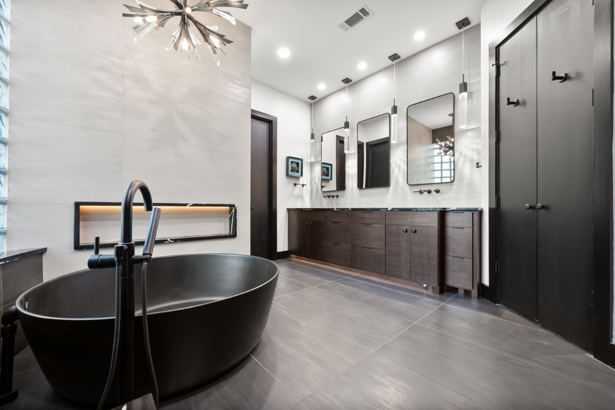 modern zen masculine bathroom shower has the cream tiles stacked main floor is 12 x 24 layed out inset and smaller darker 2 x 2 shower floor all fixtures are black toilet it white walls are painted like the paint chip in the photo